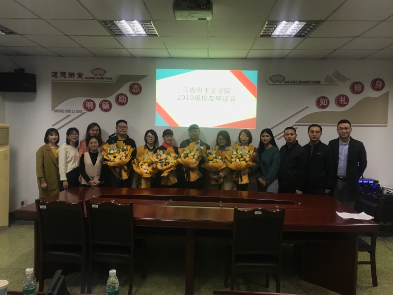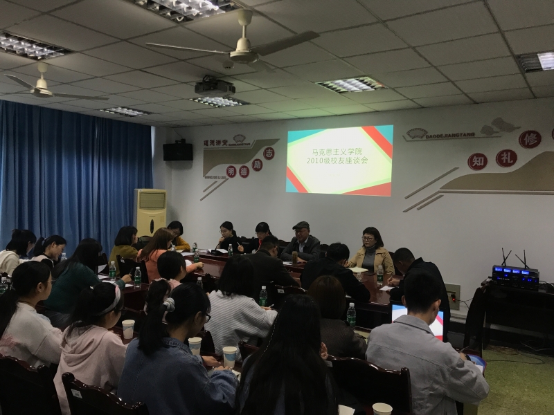 10月8日15:00,2010级思想政治教育专业10余名校友返校在学院会议室参加座谈会。同时参会的有学院院长李才俊、党总支书记刘明明、副院长张莉、学院校友会秘书长李华夏、原2010级辅导员董骞以及部分在校生代表。
