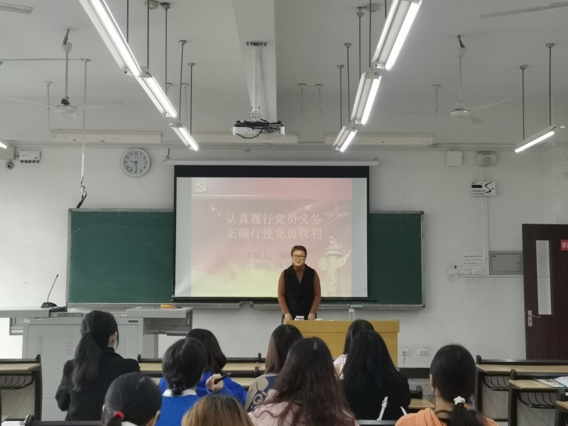 刘明明讲授《认真履行党员义务 正确行使党员权利》版块,她介绍了党员的八项义务和八项权利的具体内容,使学生们认识到党员的义务是绝对性的,权力是相对性的。同时还举例优秀共产党员沈浩的事例来激励同学们,像他学习。