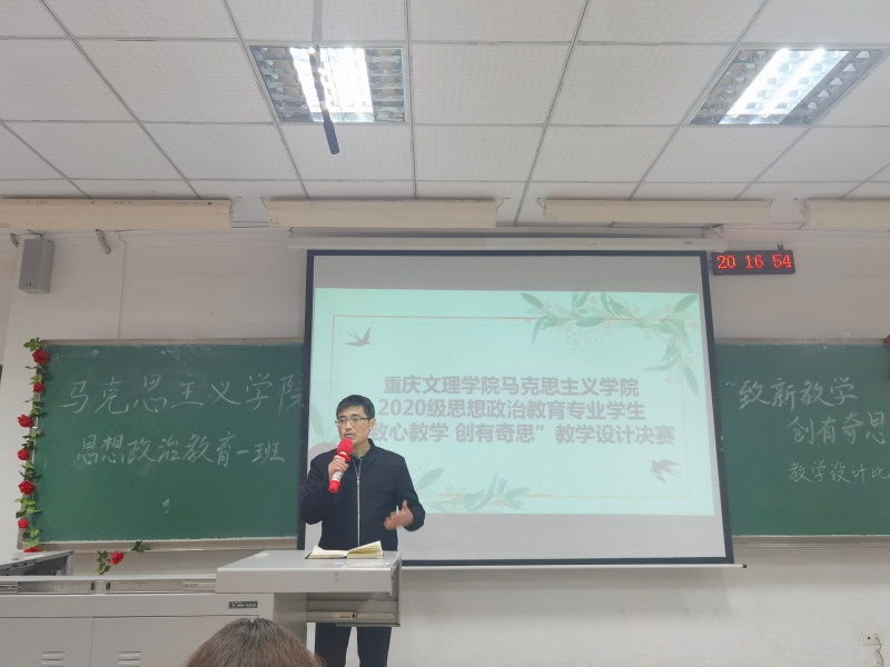 余孝军老师对本次比赛进行了点评,他分别指出了每一位同学的优点与不足,并对所有同学做出了期望,表达了对思政专业老师未来新鲜血液的期待,希望大家继续努力,深入学生和教材,做出更加优秀的教学设计,向优秀的思政教师进发。