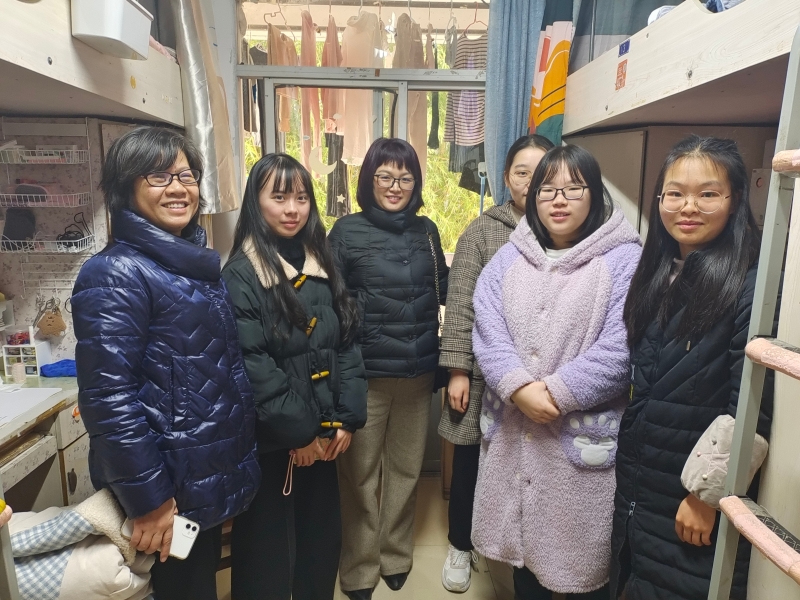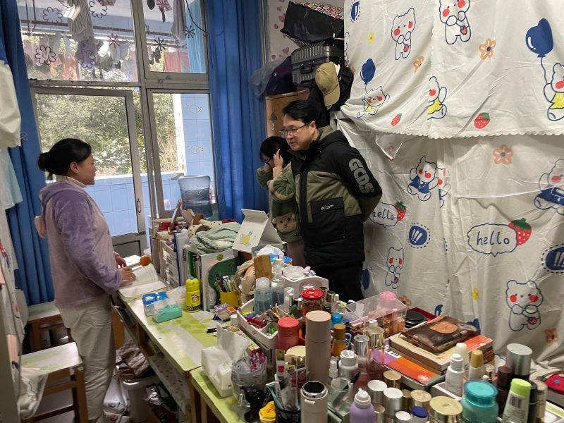 在检查过程中,胡守敏在检查中强调电线尽量不要私拉乱接,一是有安全风险。二是影响宿舍整体美观。同时,插线板又接插线板的现象突出,一定要规避插线板过多串联,避免引起用电过载到账火灾等隐患发生。刘明明在查看中讲到务必要把宿舍清洁卫生做好,要创设良好的宿舍环境;寒假即将开始,宿舍要关好水龙头、电源,自行检查宿舍的安全隐患,规避风险,锁好或者带走贵重物品。年级辅导员对重点宿舍、典型例子做了详细记录。