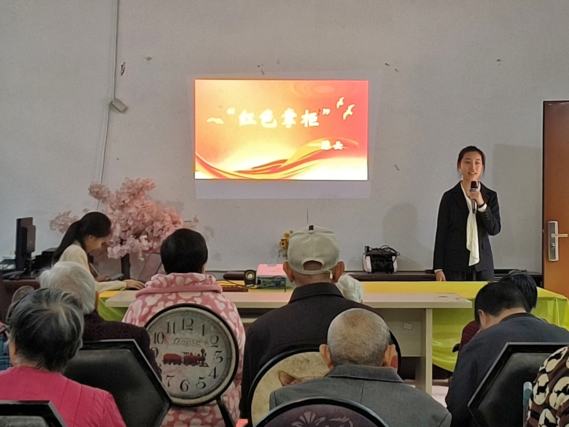 宣讲团成员在活动室为老人们讲党史故事。宣讲团成员以饱满真挚的感情、生动形象的语言,结合丰富的图片、视频资料,先后讲述“广州起义”“红色掌柜陈云”“中国奥运第一人刘长春”等一个个波澜壮阔、振奋人心的红色故事。