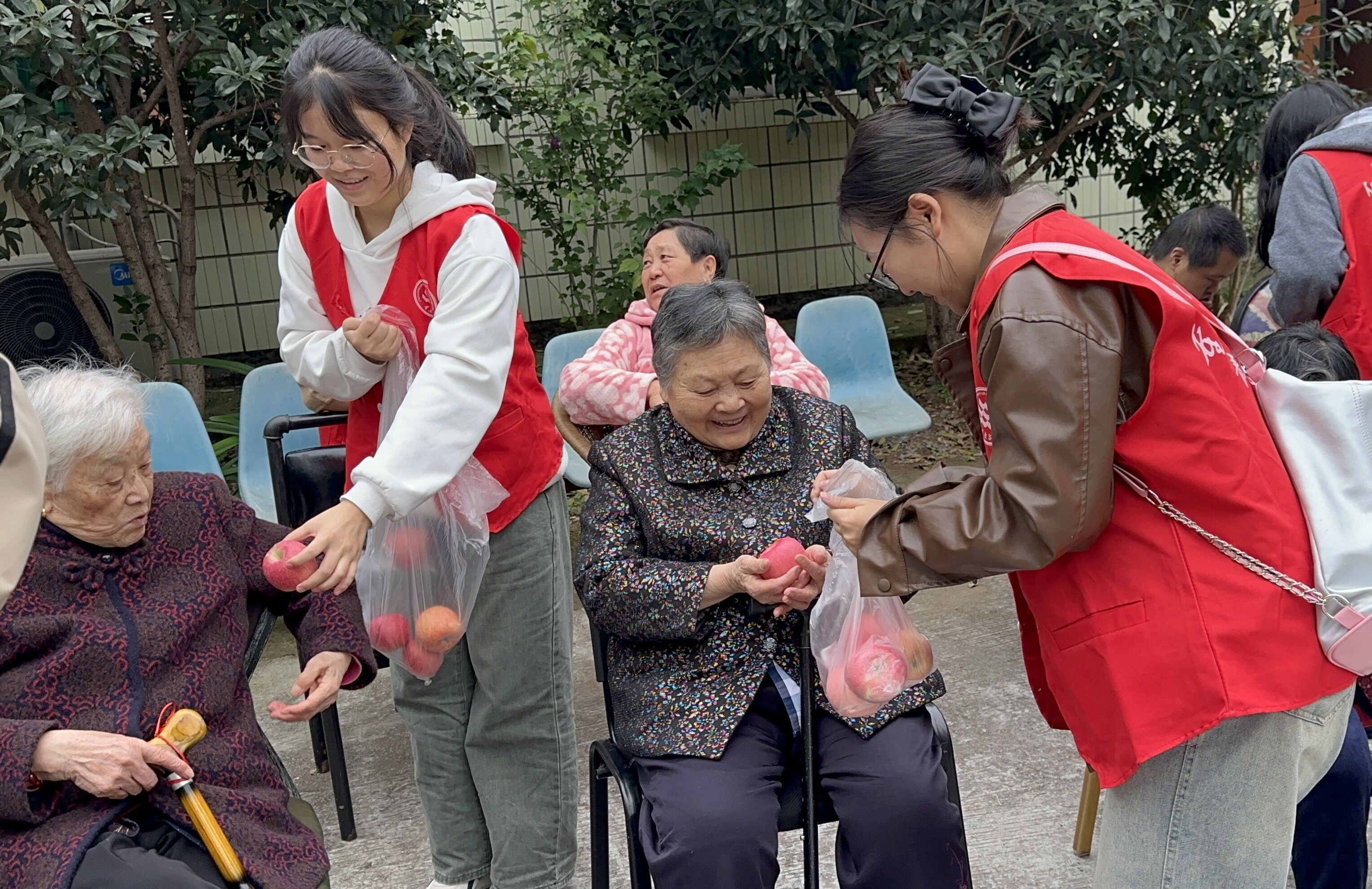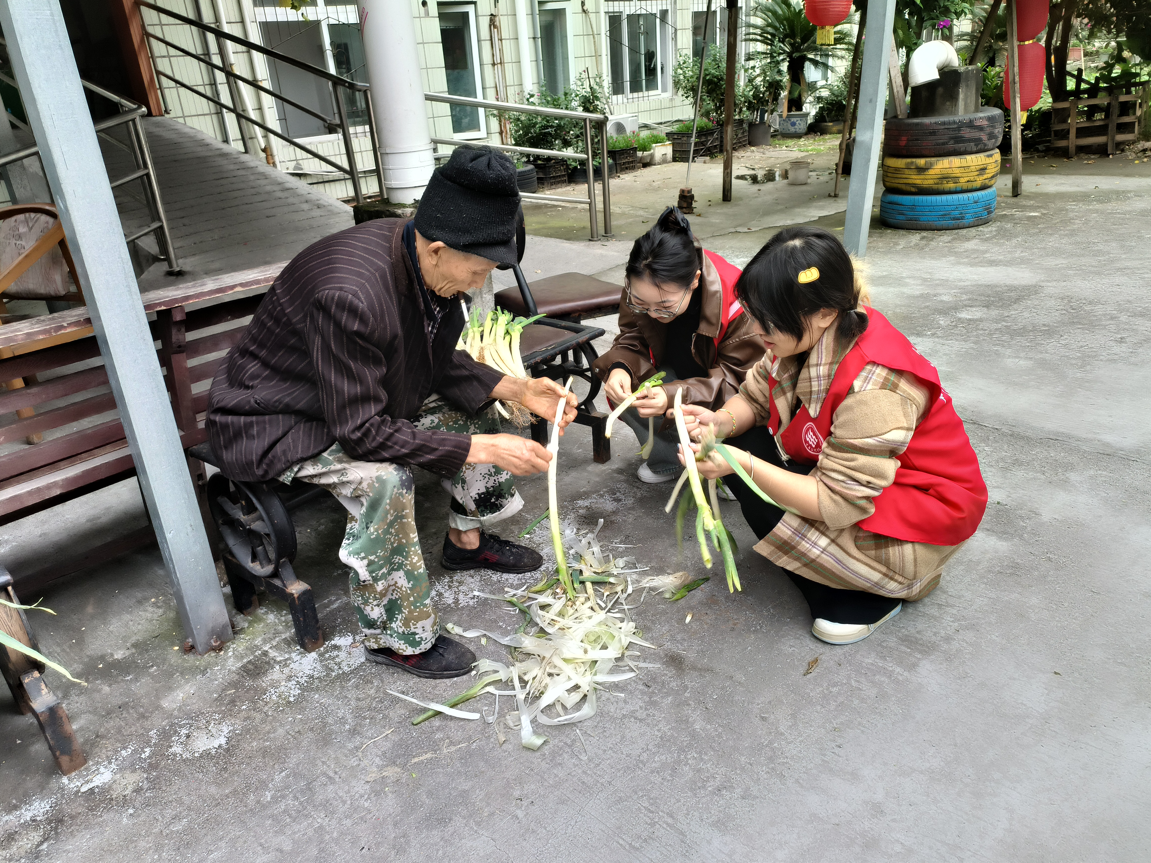 在敬老院,志愿者们先是陪老人们聊家常,帮忙整理房间、清扫院坝,并同后厨工作人员一起为老人们准备饭菜。