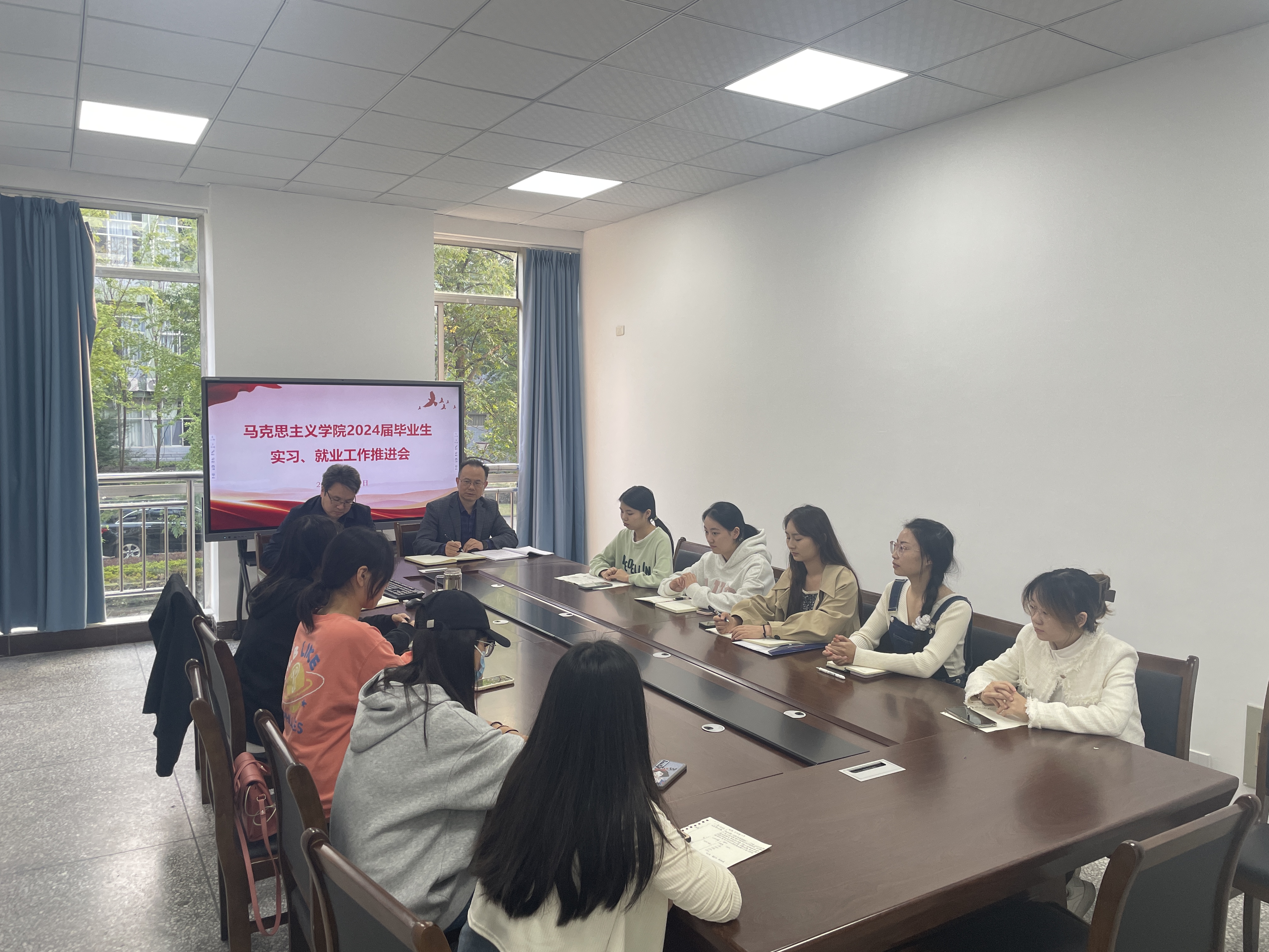近日,mansion88主页在知津楼B210会议室召开2024届毕业生实习交流暨就业工作推进会,学院院长胡守敏、党总支书记杨正强、毕业班辅导员李华夏,非考研的10余名学生代表参加会议。会议由学院学工办主任李华夏主持。