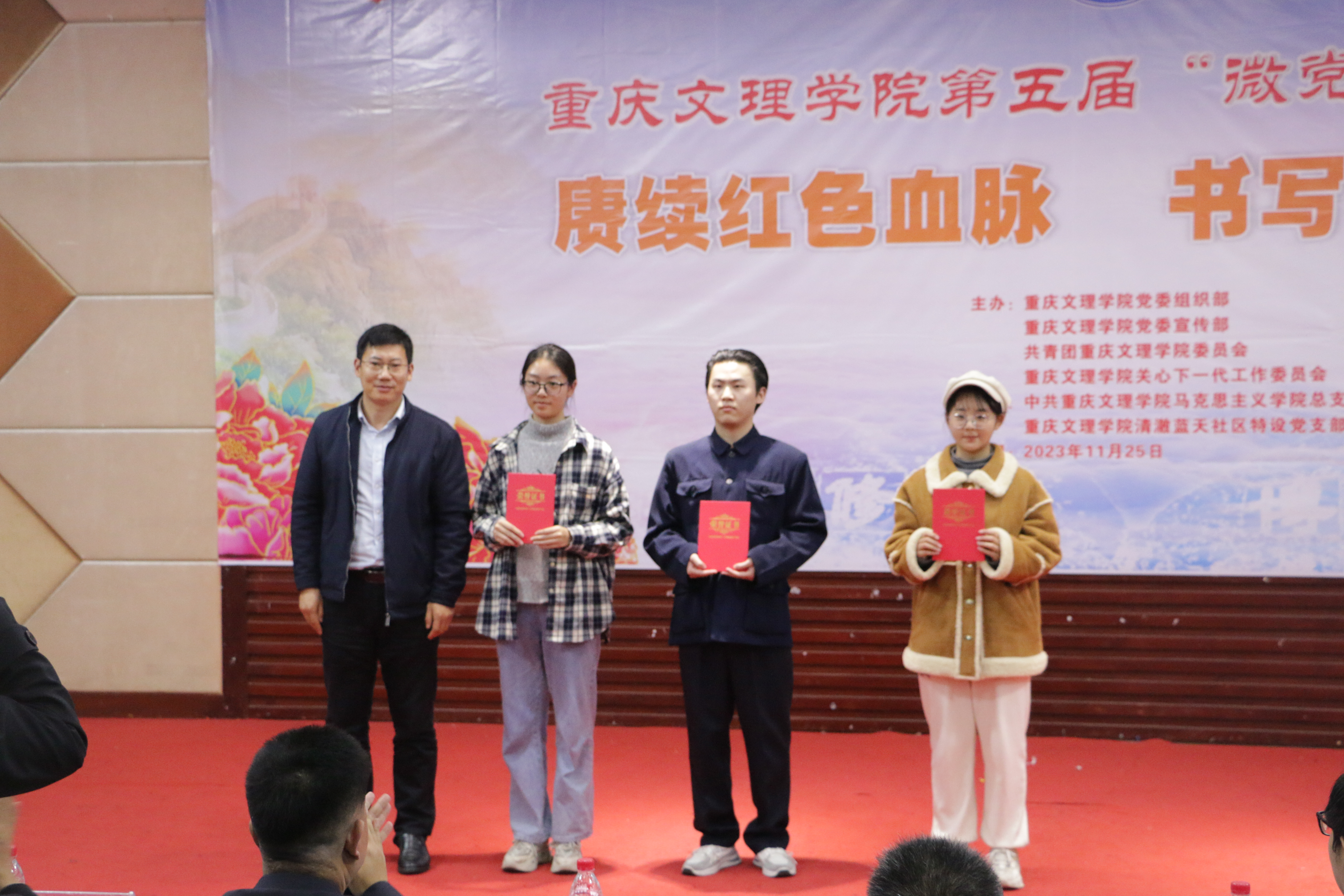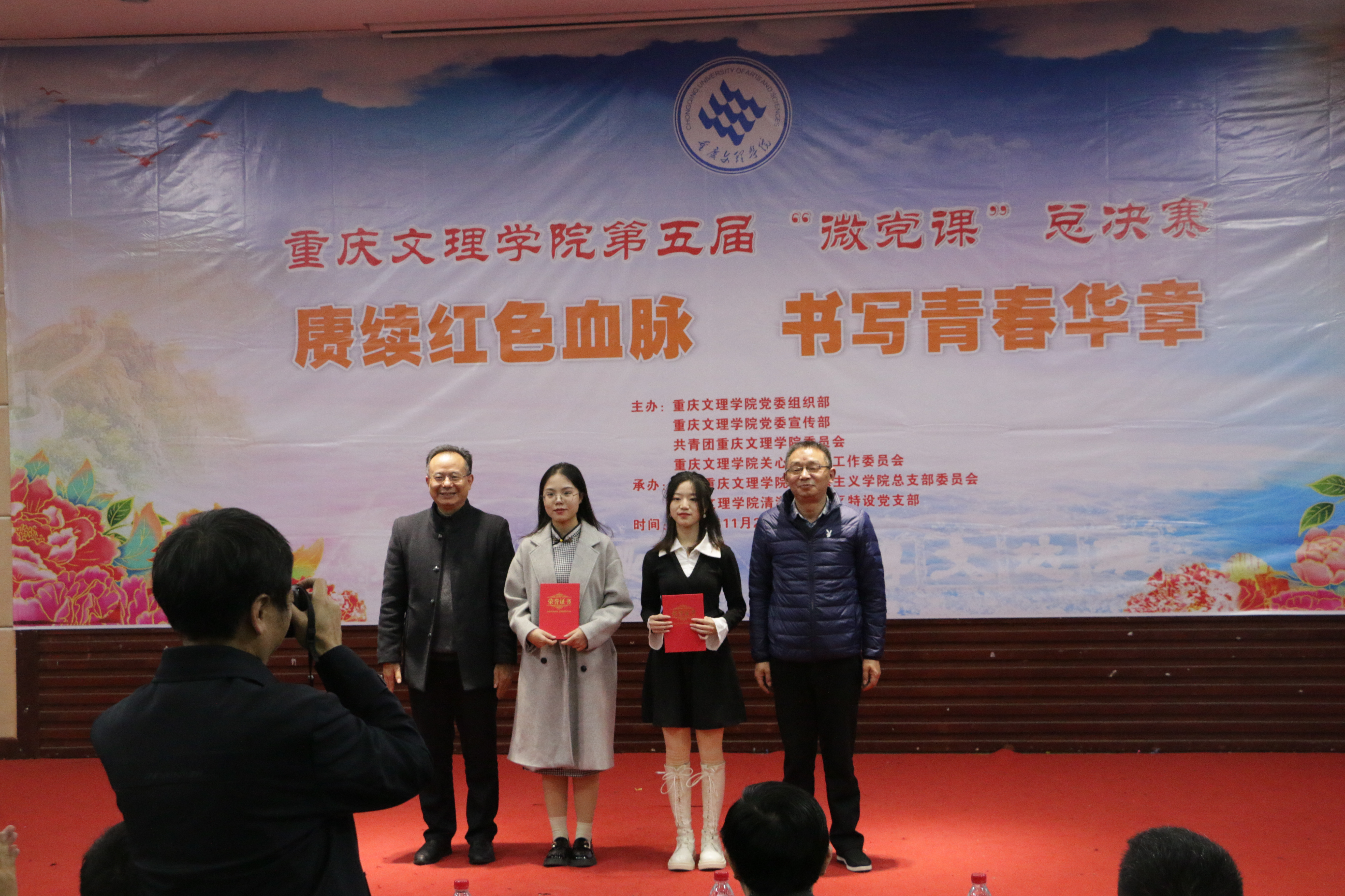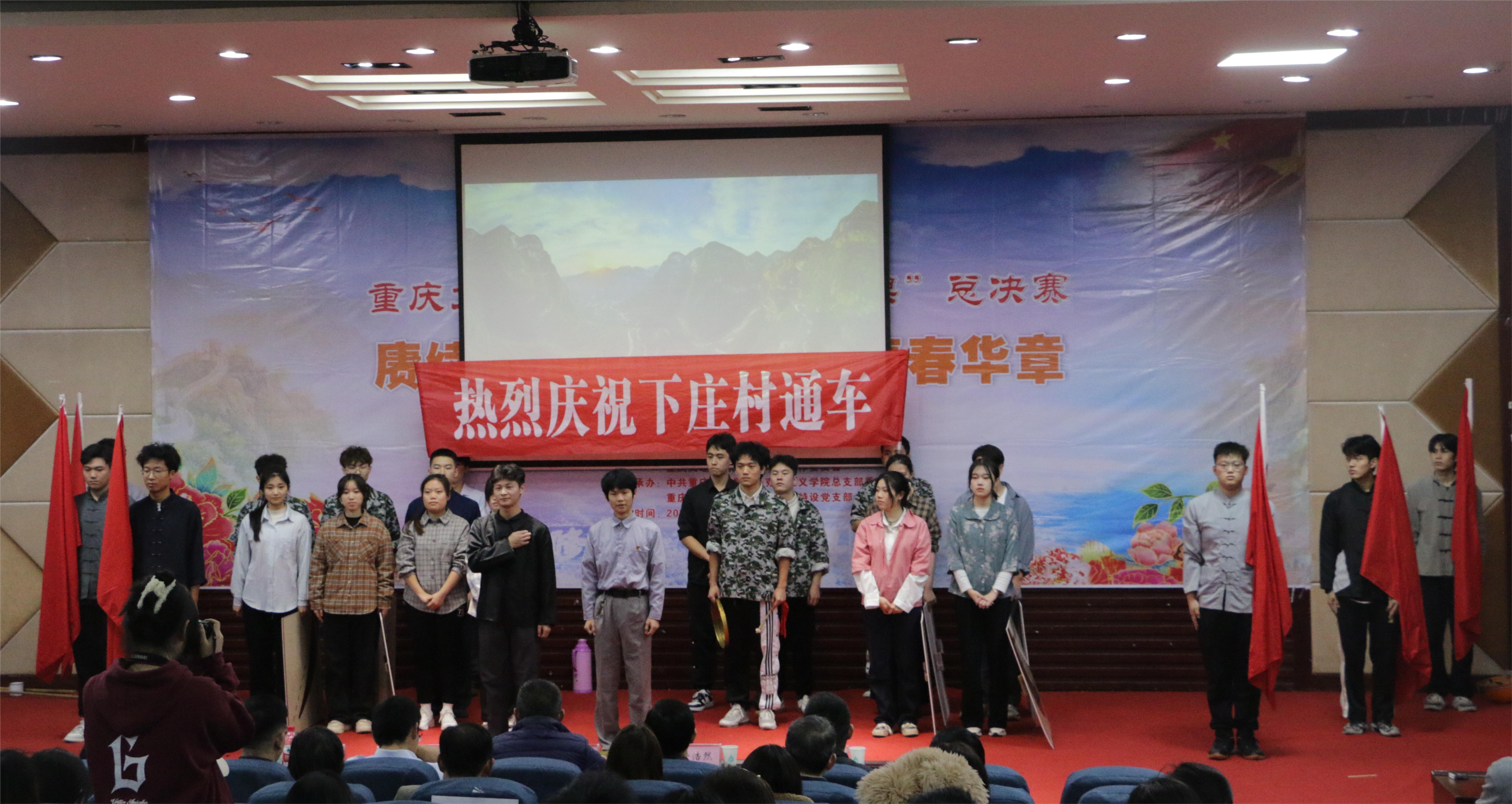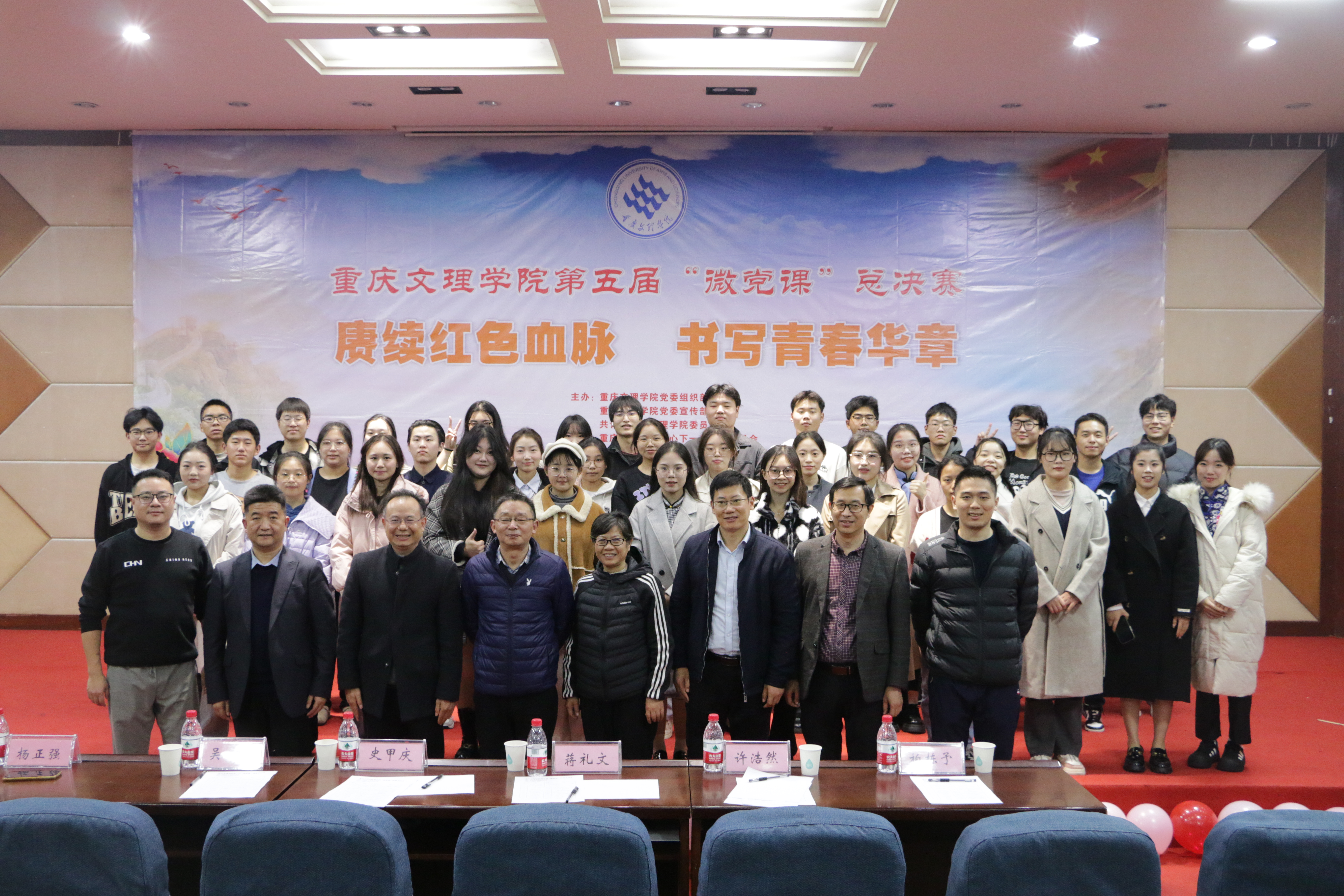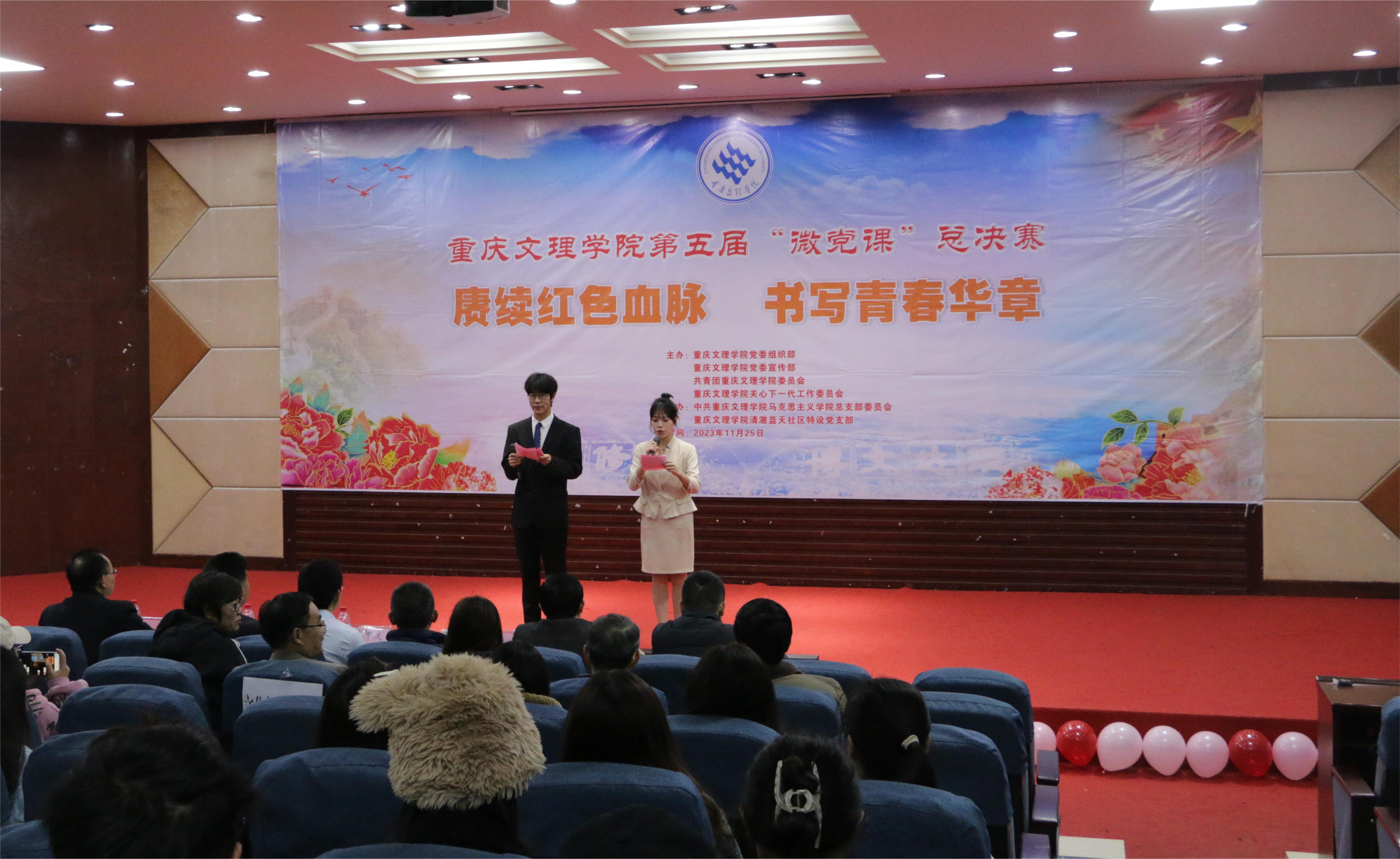 为深入学习贯彻习近平新时代中国特色社会主义思想和党的二十大精神,引领广大青年赓续红色血脉,传承红色基因,书写青春华章,学校持续开展“微党课”比赛品牌活动。11月25日晚,由重庆文理学院党委组织部、党委宣传部、校团委、校关工委主办,mansion88主页党总支、清澈蓝天社区特设党支部承办的第五届“微党课”比赛总决赛在博文馆101报告厅举行。学校党委组织部、党委宣传部、党委学工部、纪检监察室、校团委等部门负责人参加活动并担任总决赛评委。mansion88主页班子成员、各二级学院师生代表共计240余人观摩了比赛。