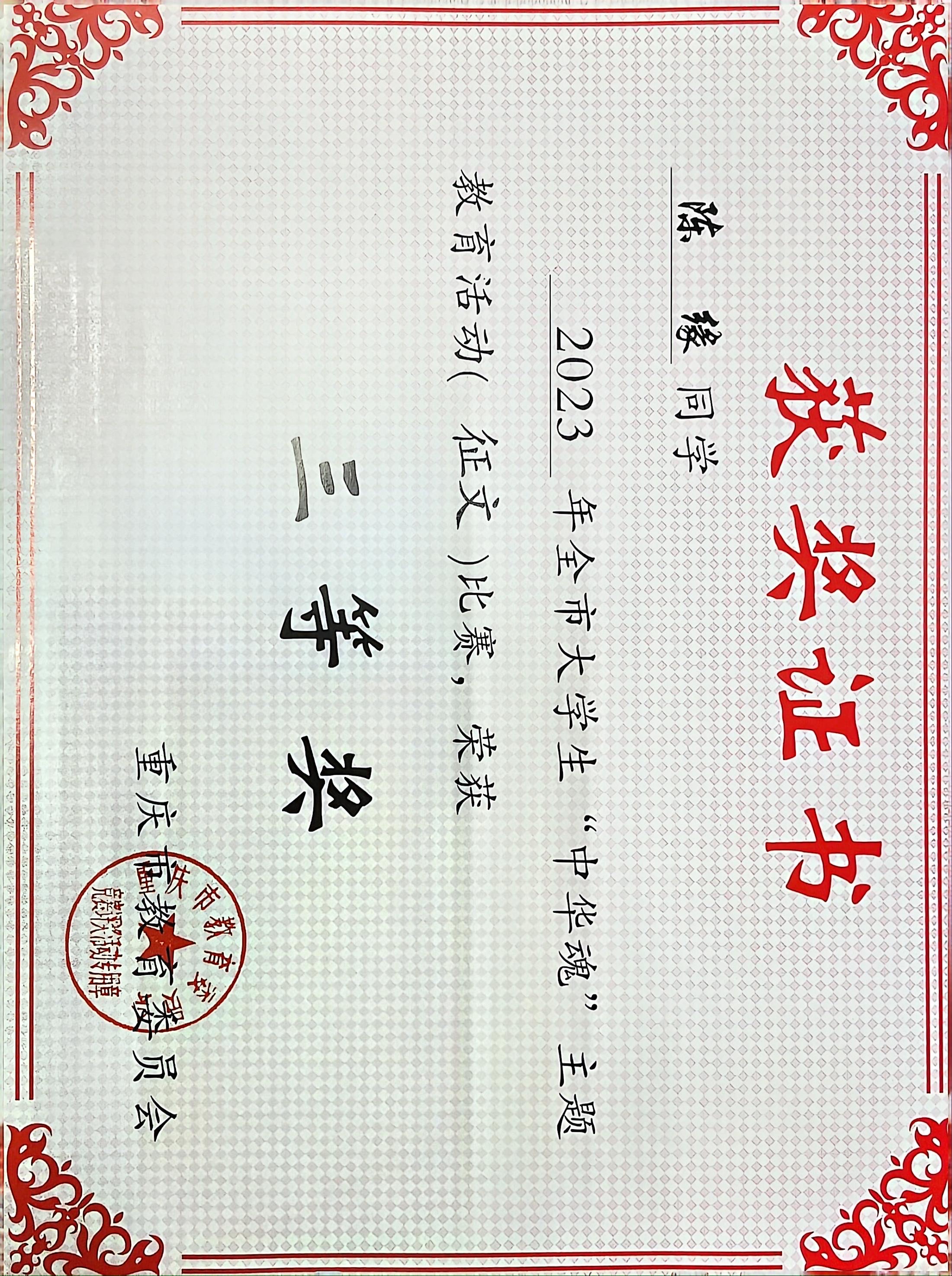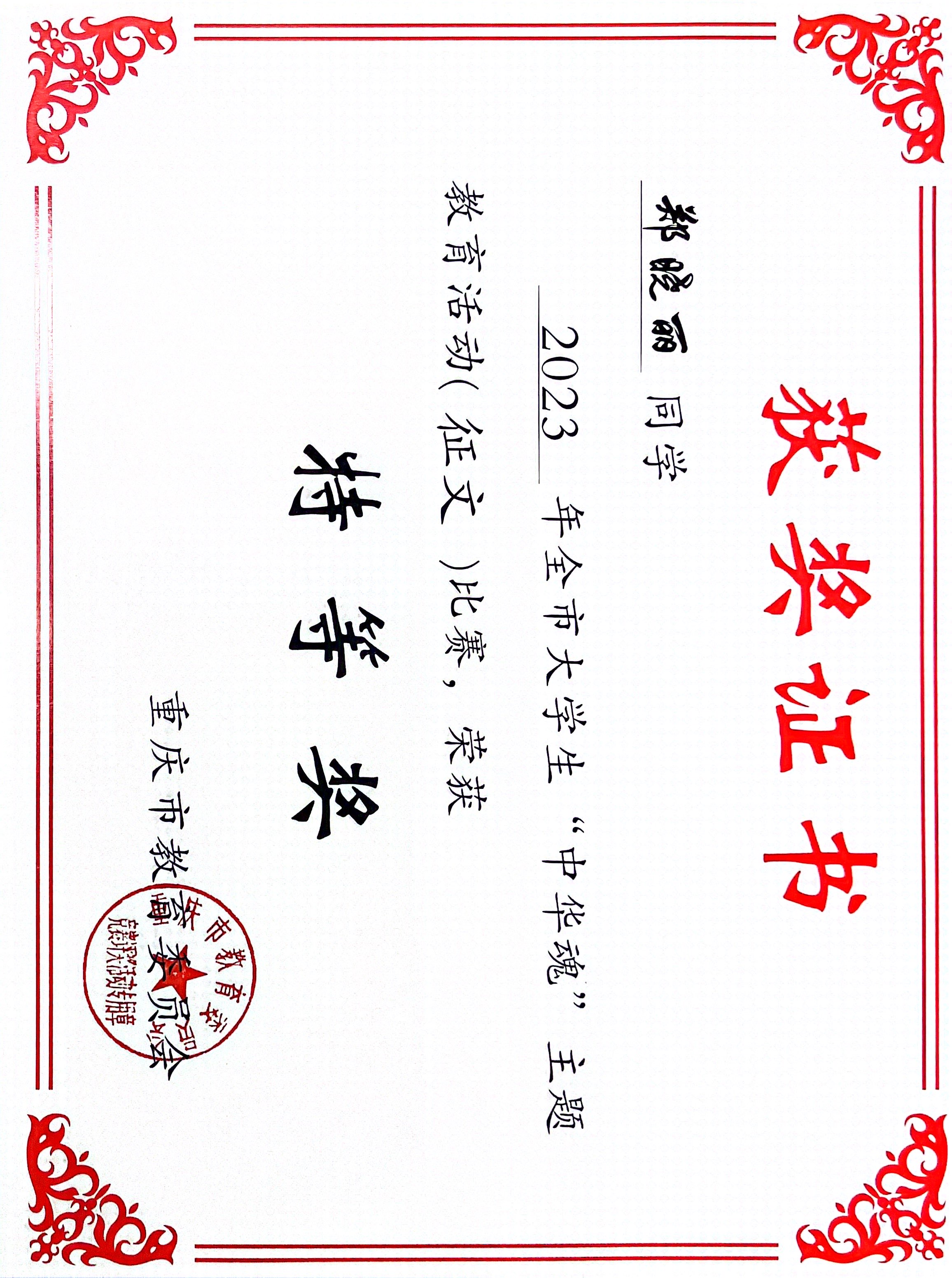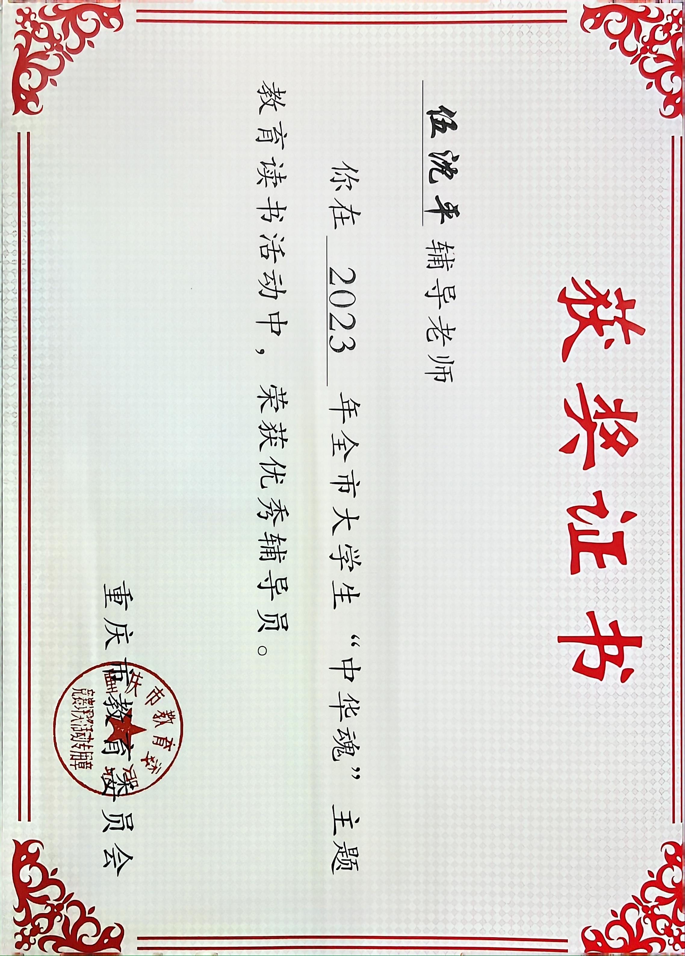 近日,重庆市教育委员会组织开展的大学生“中华魂”主题教育活动比赛结果揭晓,重庆文理学院mansion88主页组织师生积极参与,并获佳绩。其中郑晓丽同学获得全市大学生“中华魂”主题教育活动(征文)比赛特等奖,简秀娟、刘洮希、陈缘三位同学获得三等奖。李华夏、伍沈平两位老师获得全市大学生“中华魂”主题教育读书活动“优秀辅导员”荣誉称号。