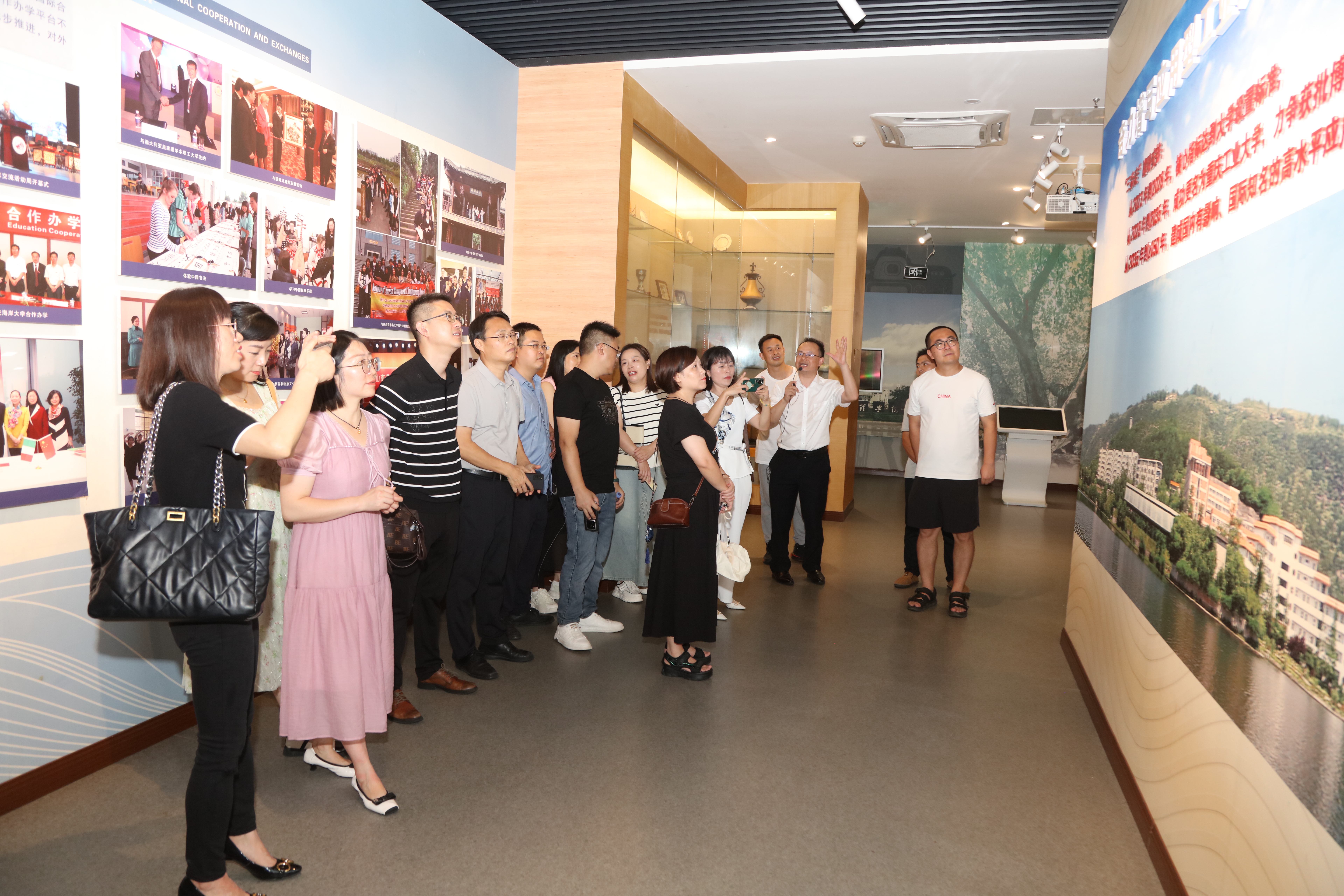 来到校史馆——峻德馆,杨正强从文理之道、文理之路、文理之辉、文理之梦四个方面,向校友们详细解说了学校的校徽、校训、校歌、办学理念和办学思路,带领大家重温了学校近50年建设发展历程,介绍了学校近年来在人才培养、学科建设、科学研究、社会服务、文化传承与创新、国际合作与交流等方面取得的突出成绩。同时向校友们隆重介绍了学校分三步走建设应用型工业大学的发展愿景。来到卫星湖桃花岛、北山校区等模拟场景处,校友们十分激动,纷纷驻足拍照留影。