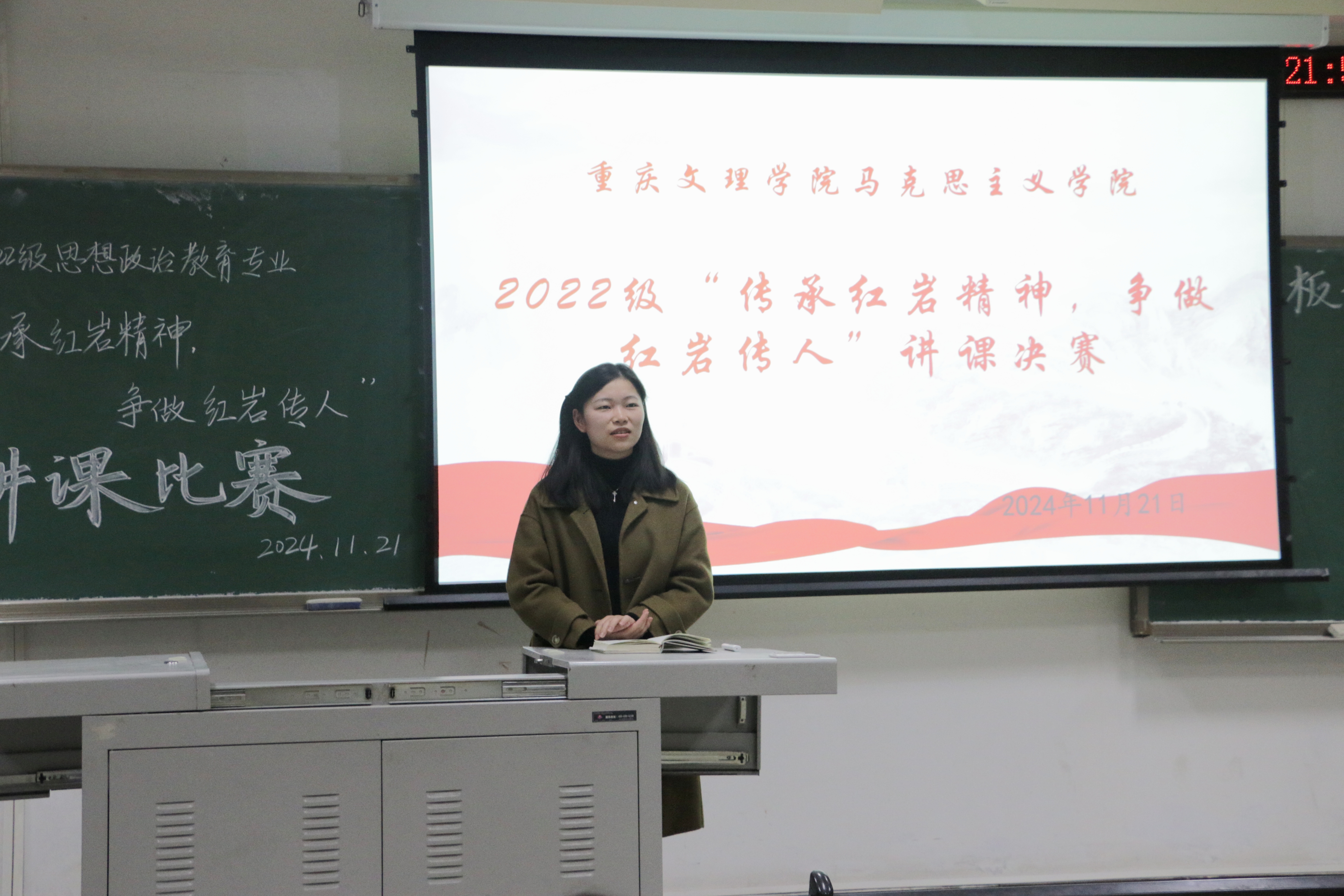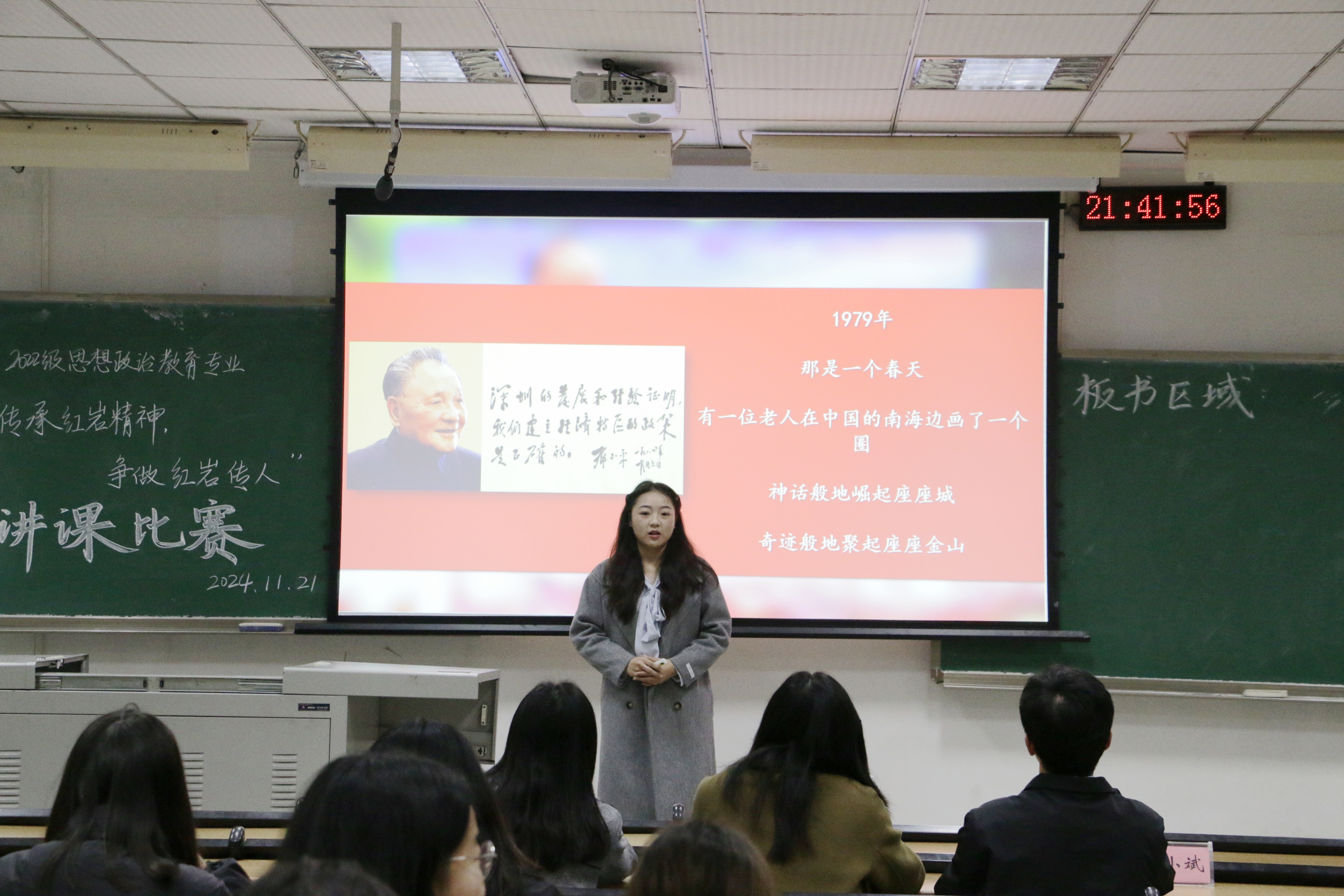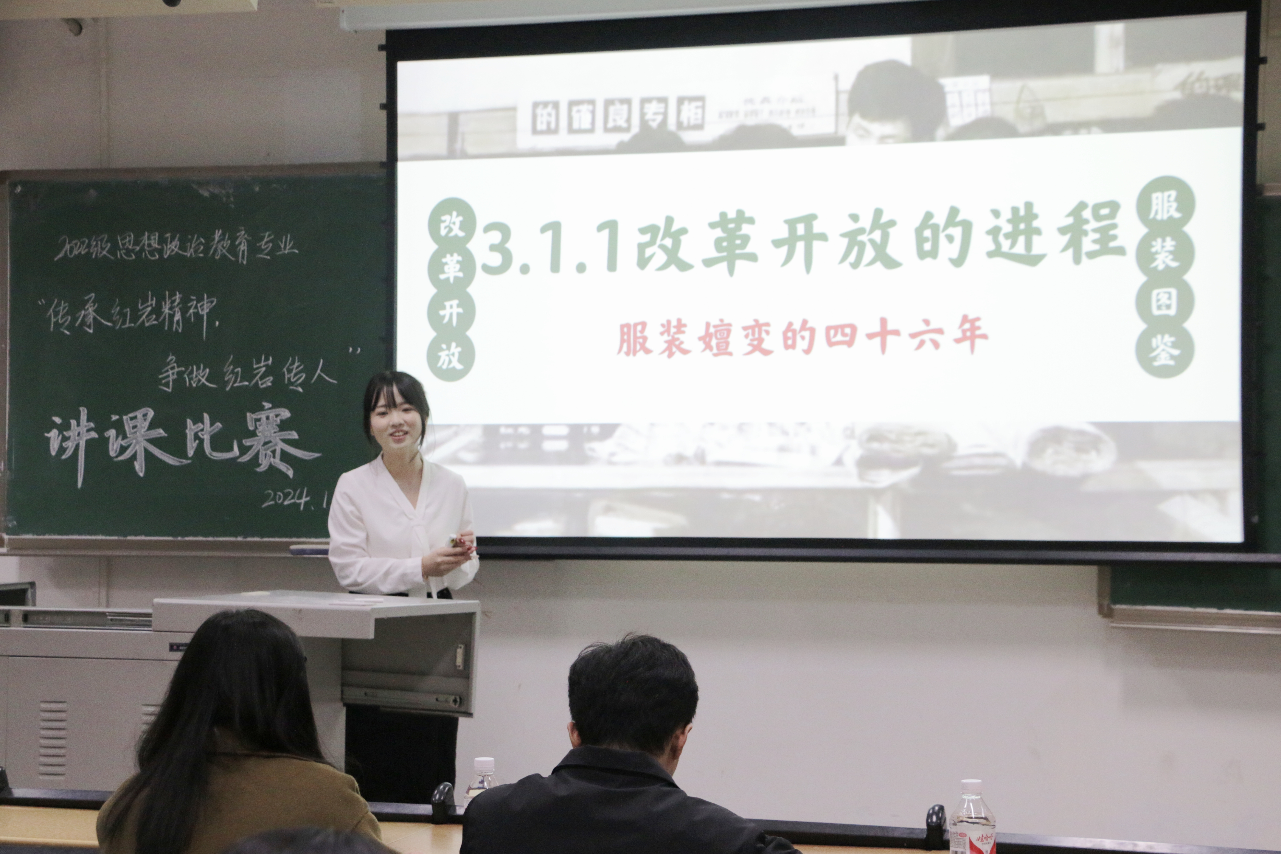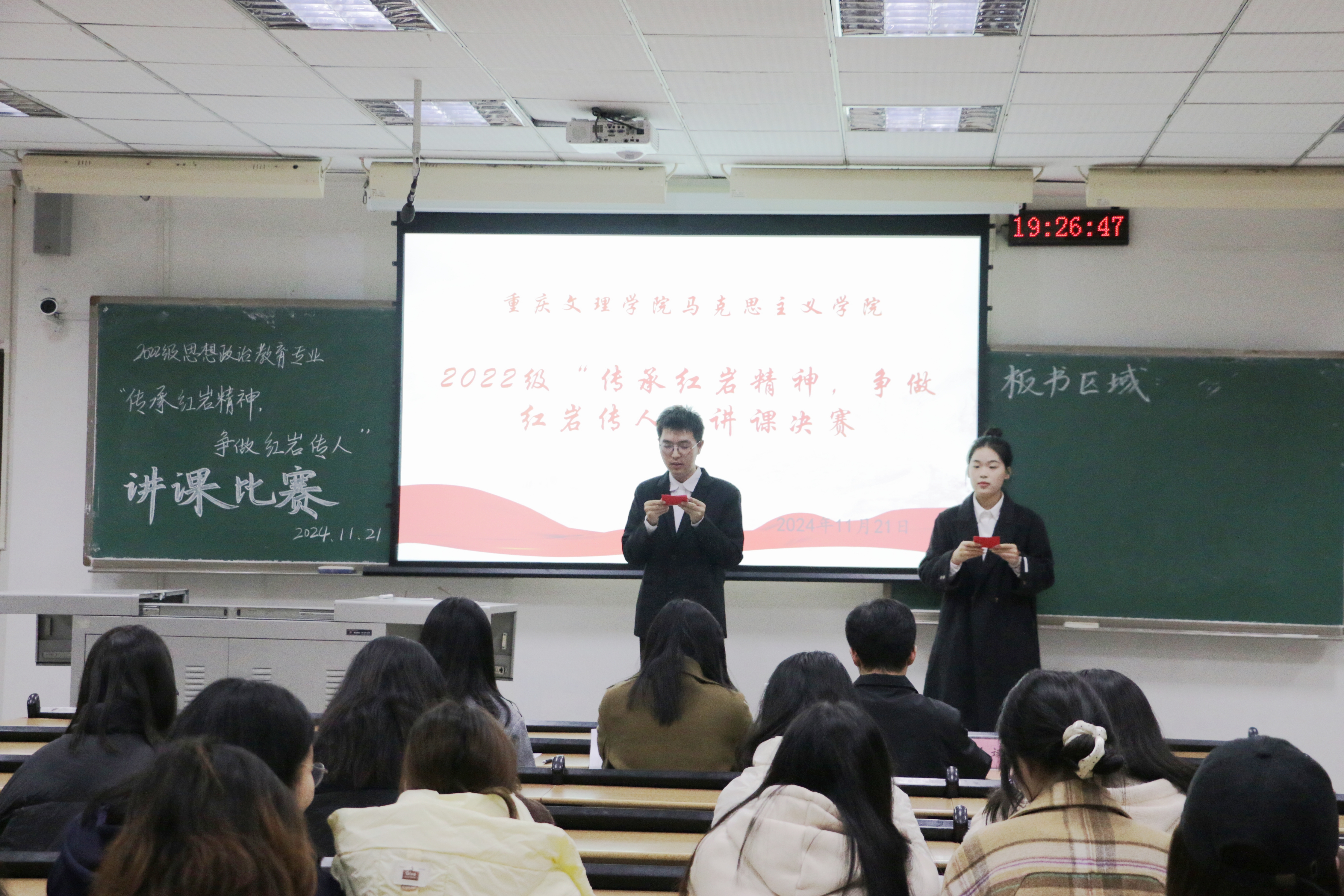 为提高mansion88主页思想政治教育专业学生的专业技能,展示教学改革的新成果,我院于11月21日晚在红河A区知津楼D204成功举办了主题为“传承红岩精神,争做红岩传人”的讲课比赛决赛。陈垒垒、董芳芳、李小斌三位老师担任评委。