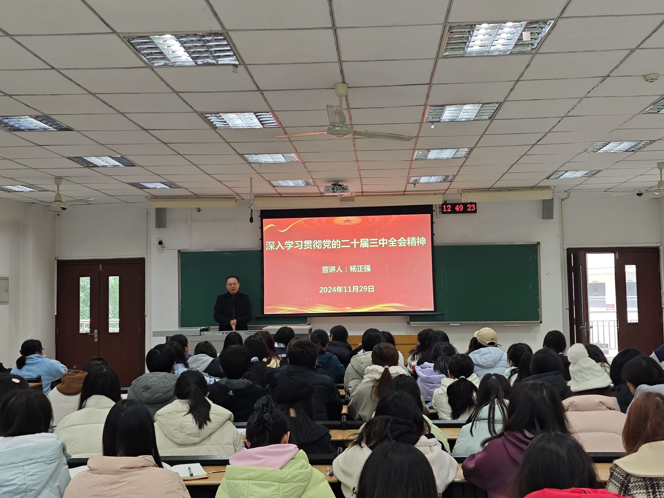 11月29日,mansion88主页党委书记杨正强在知津楼D201教室为学生宣讲党的二十届三中全会精神,mansion88主页第八期团校全体学员聆听了报告。