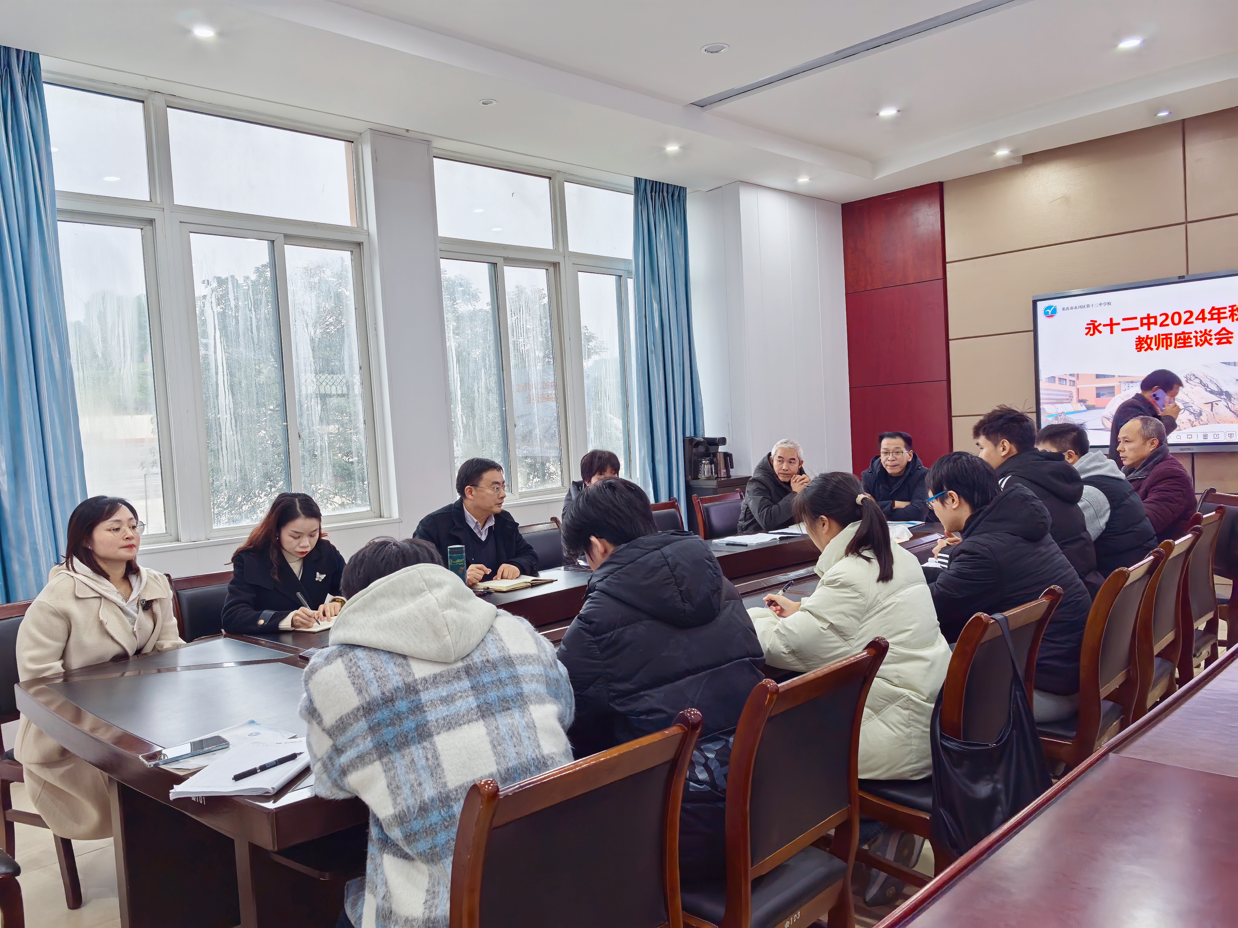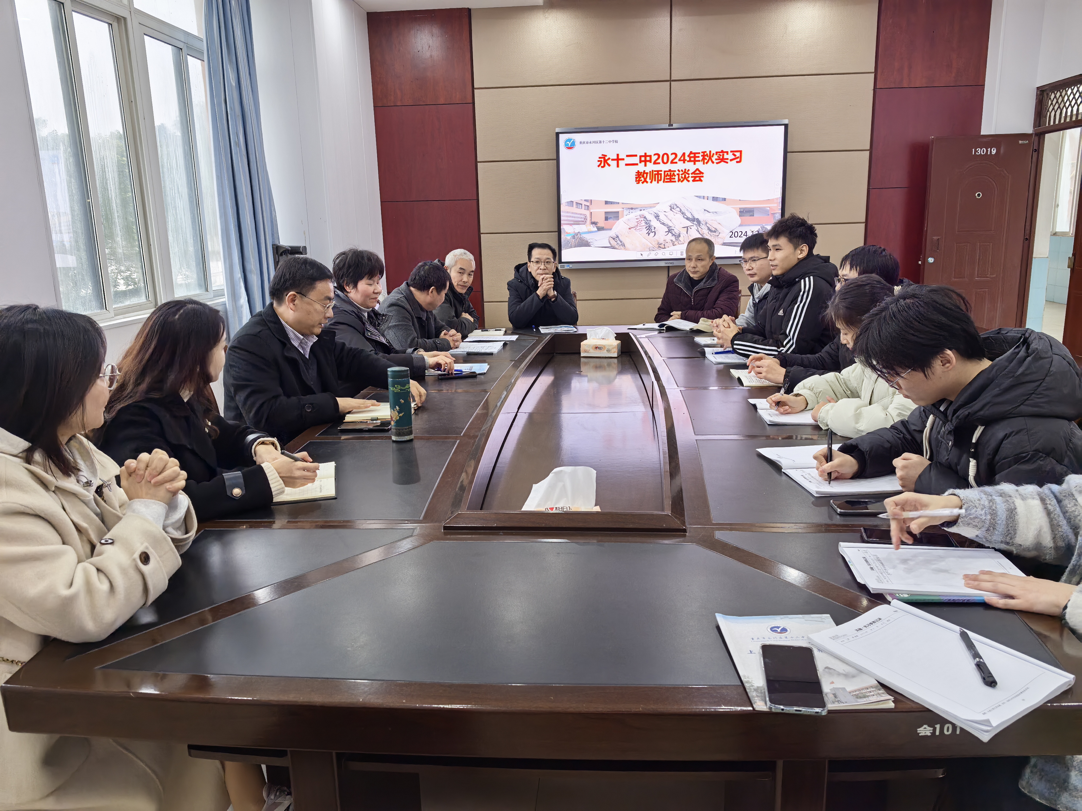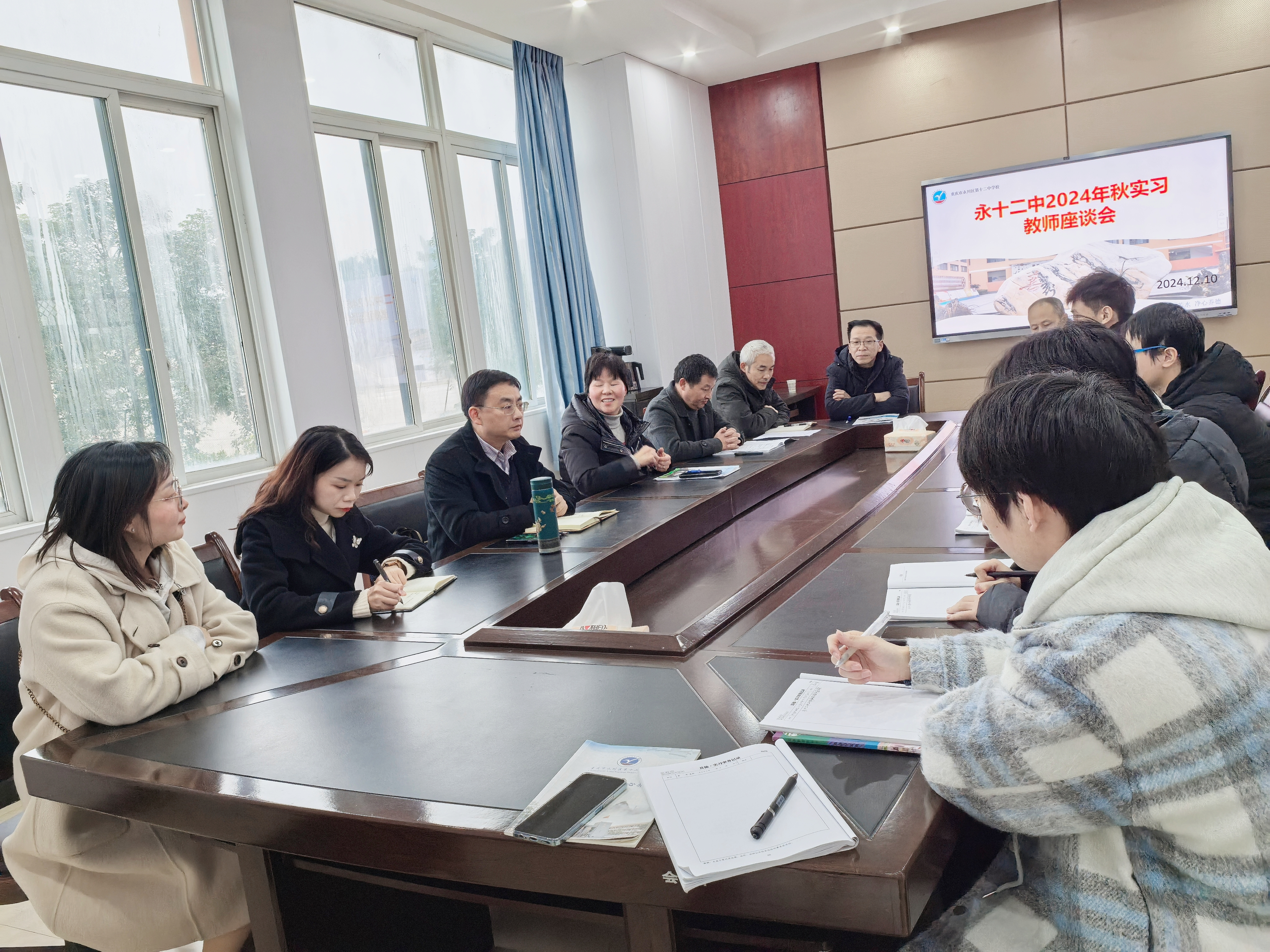 2024年12月10日下午,mansion88主页党委副书记、纪委书记、副院长李景国带队前往永川区第十二中学校调研2021级思想政治教育(师范)专业学生实习情况。永川区第十二中学校副书记钟月英,副校长杨宏军,指导教师及我校派出的实习指导老师、实习学生等参加了调研交流。