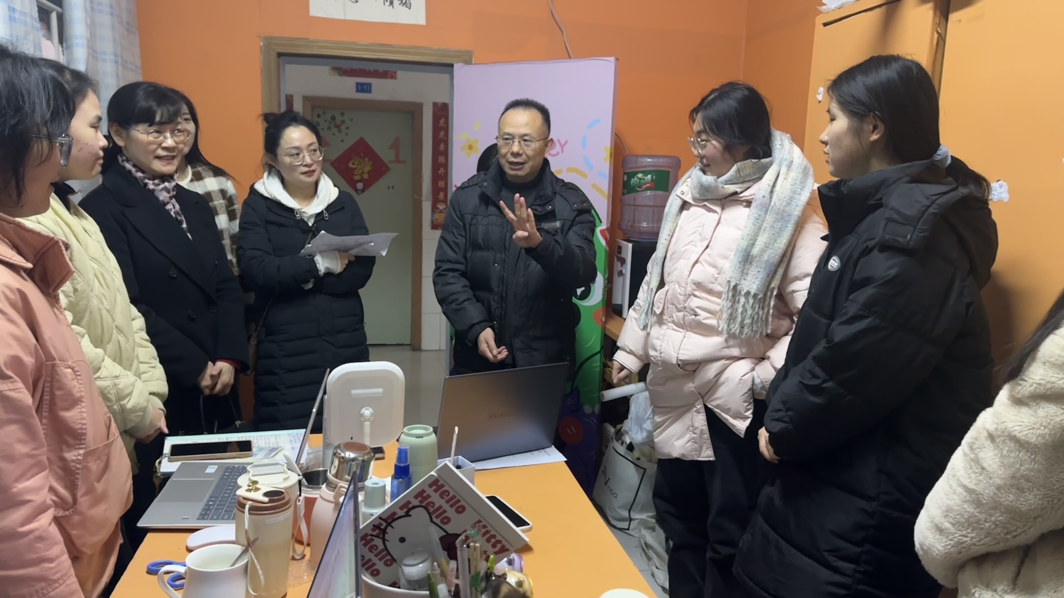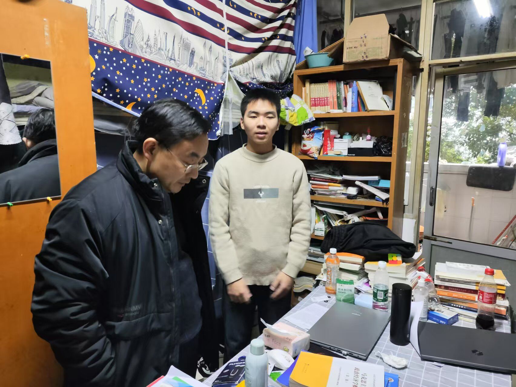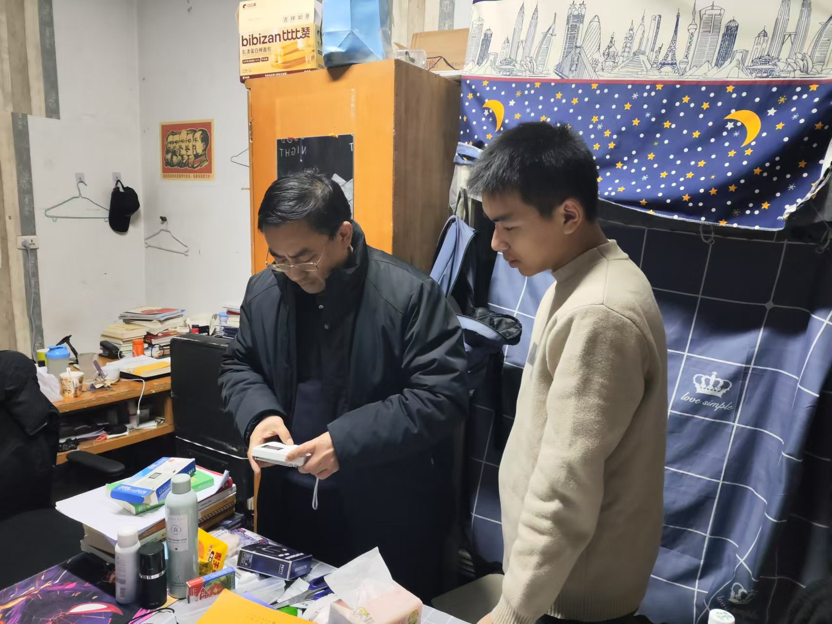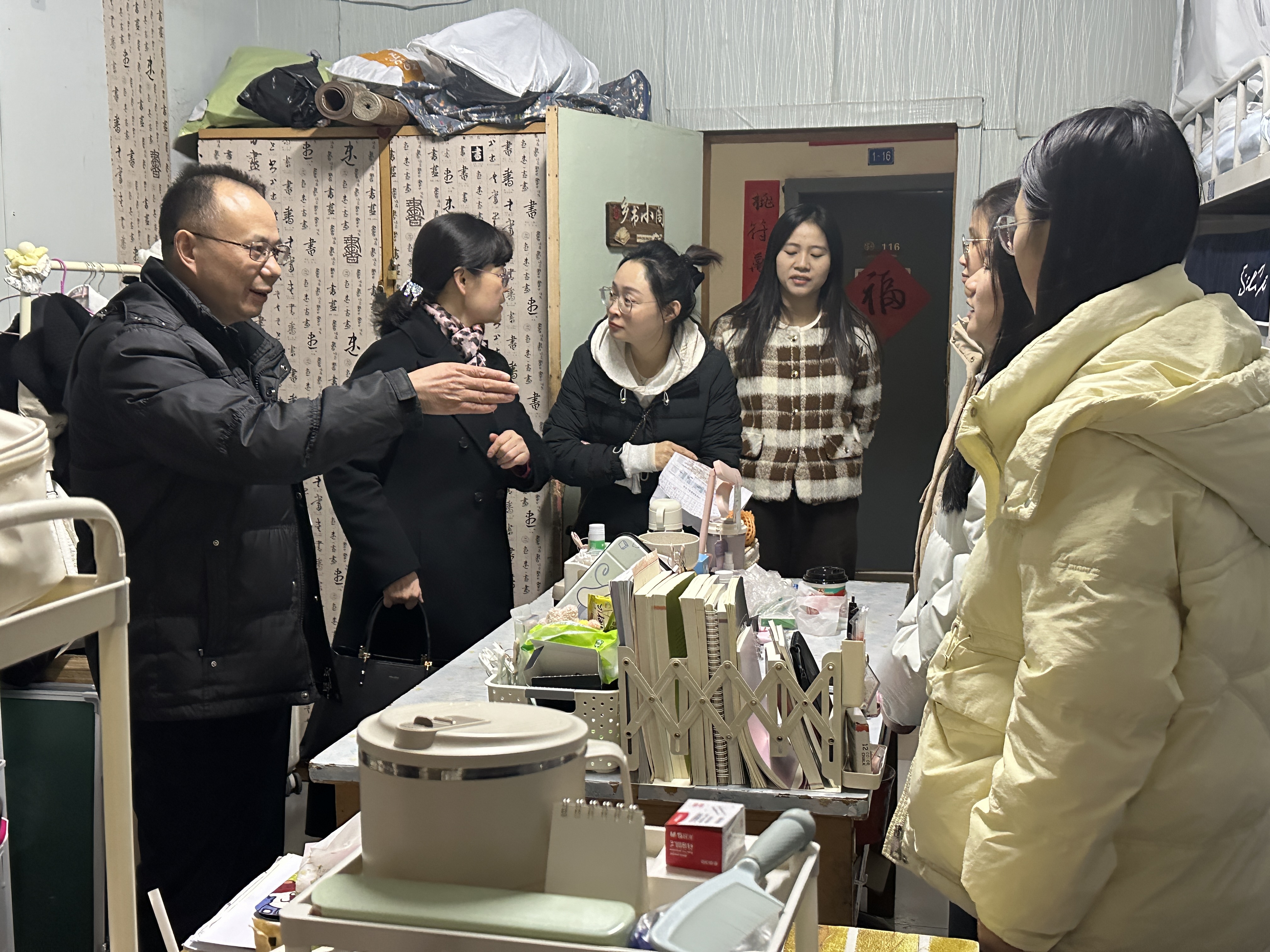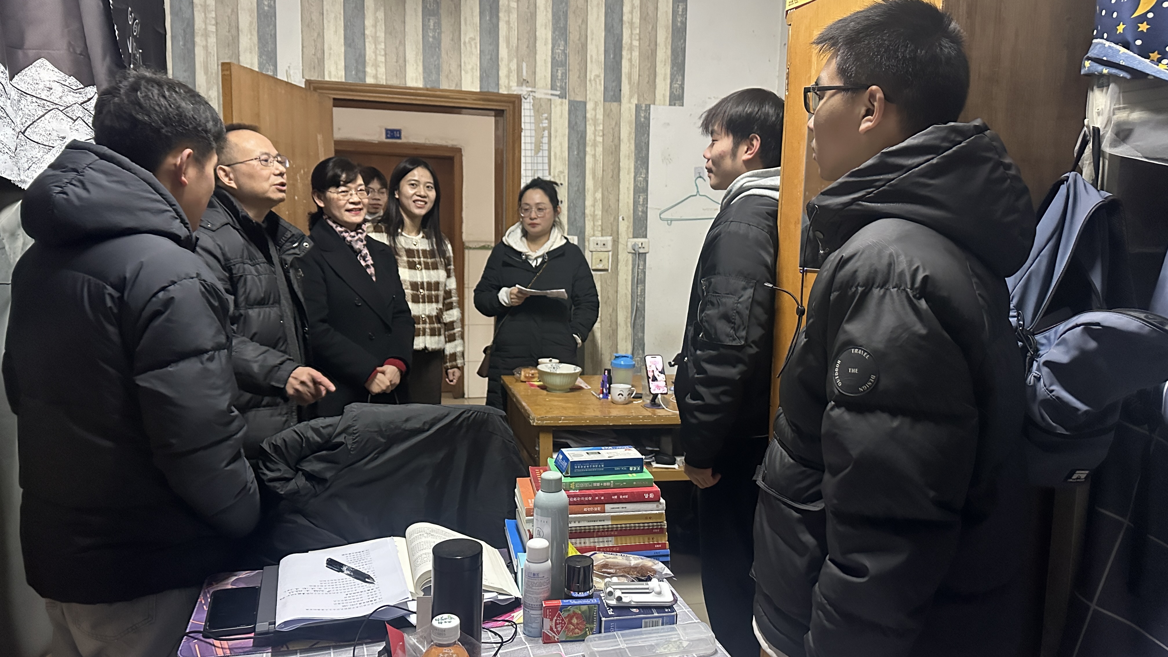 12月24日晚,mansion88主页党委书记杨正强,党委副书记、院长张莉,党委副书记、纪委书记、副院长李景国,辅导员伍沈平、教师黄慧敏带队深入学生宿舍,开展走访慰问和安全检查。