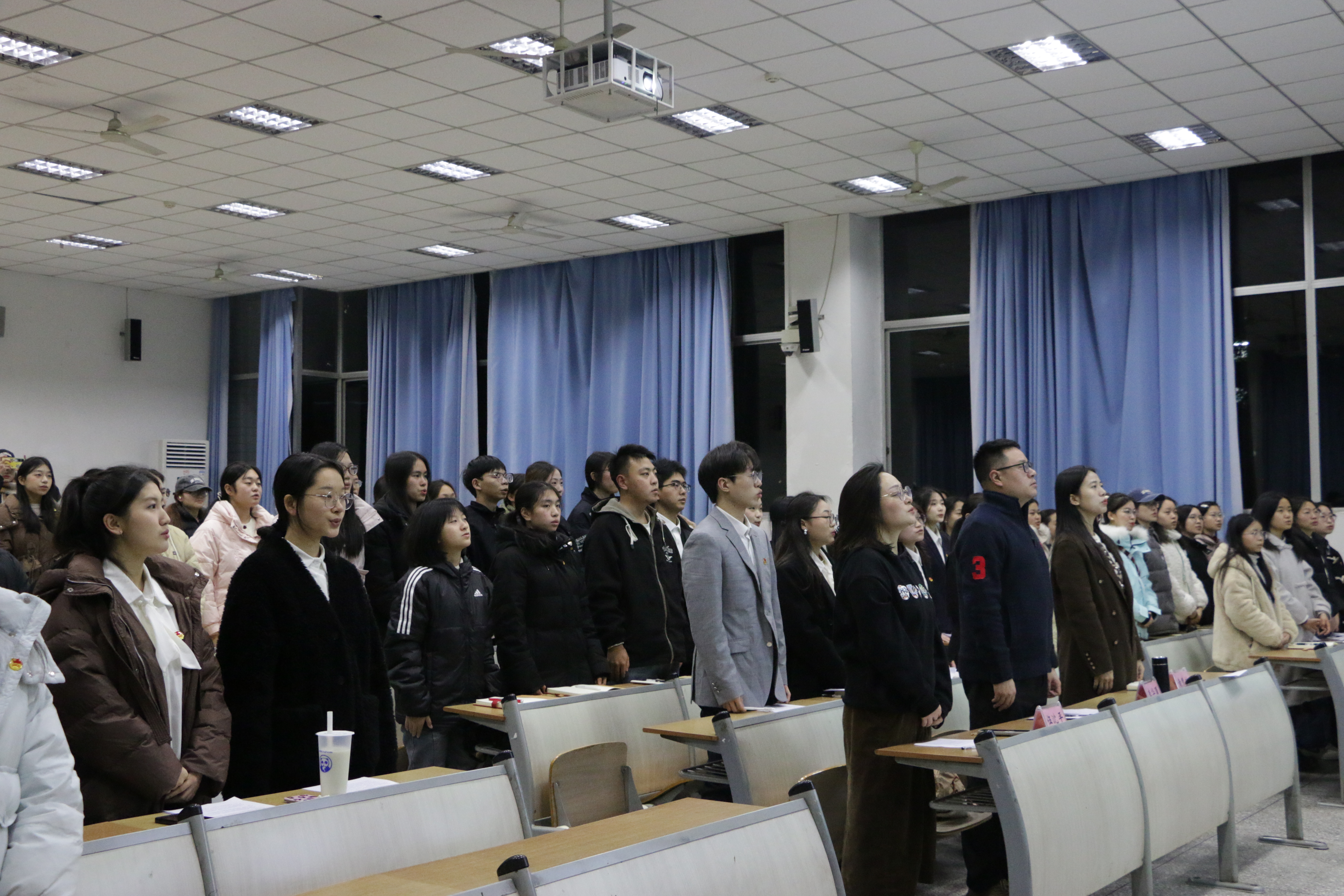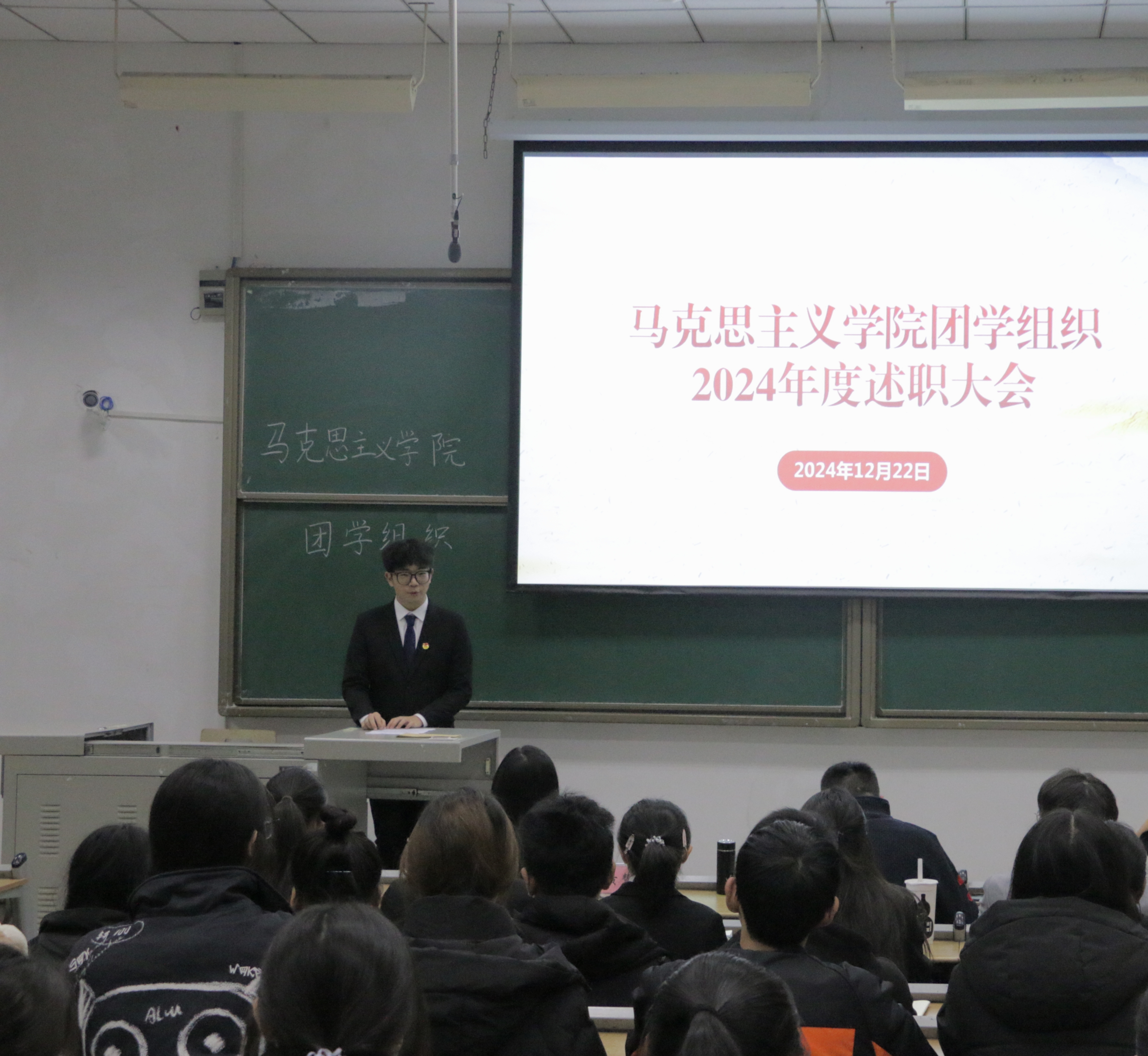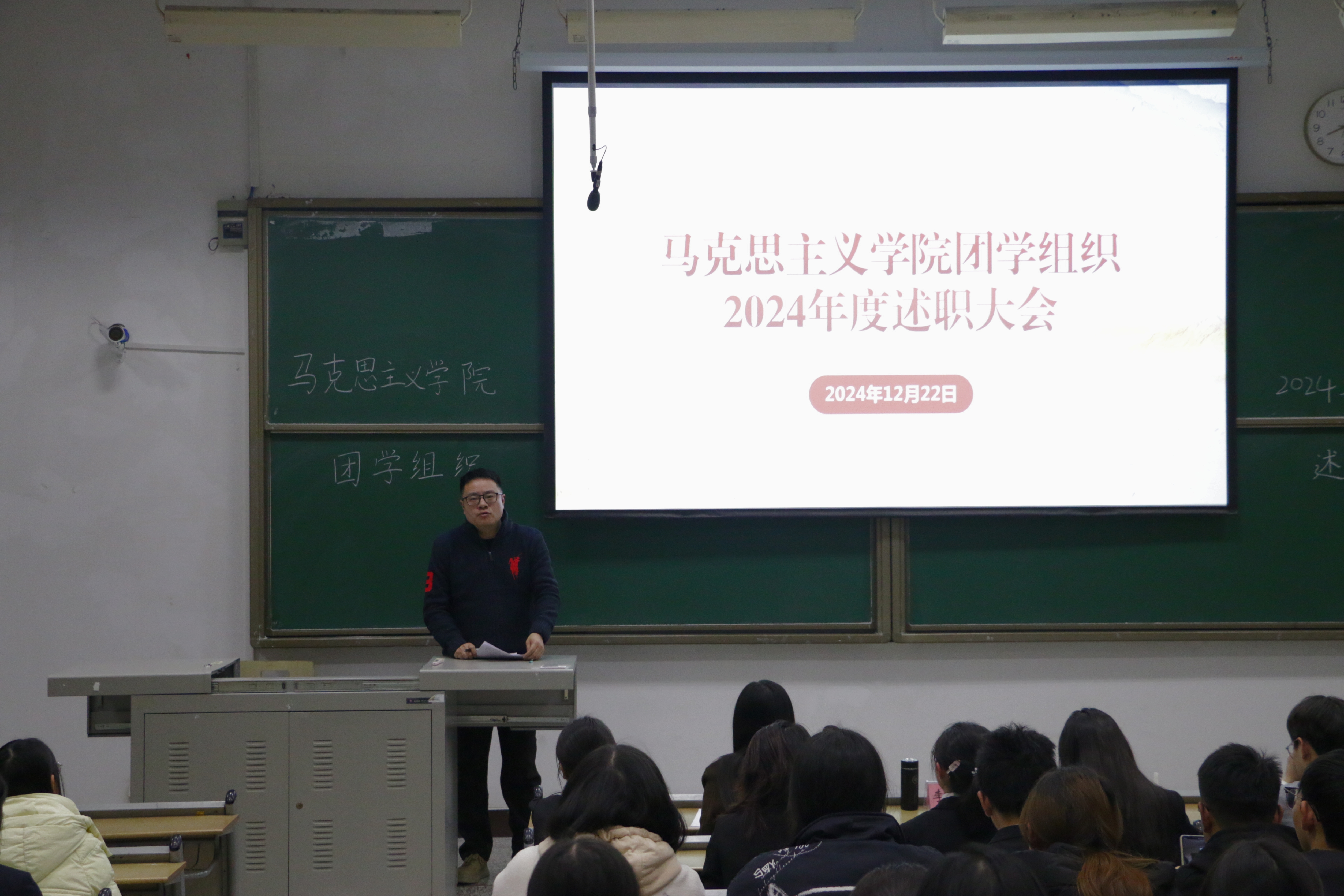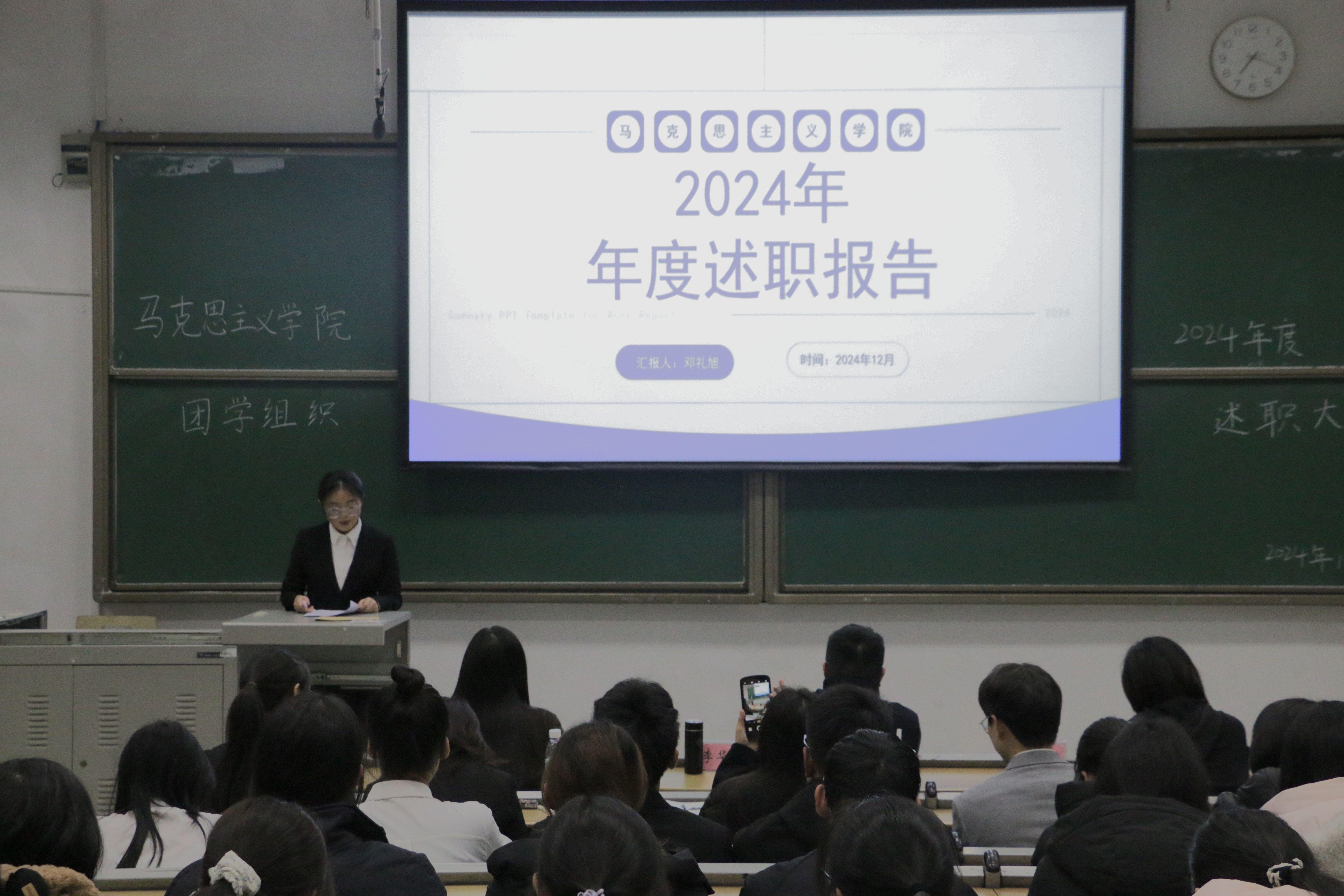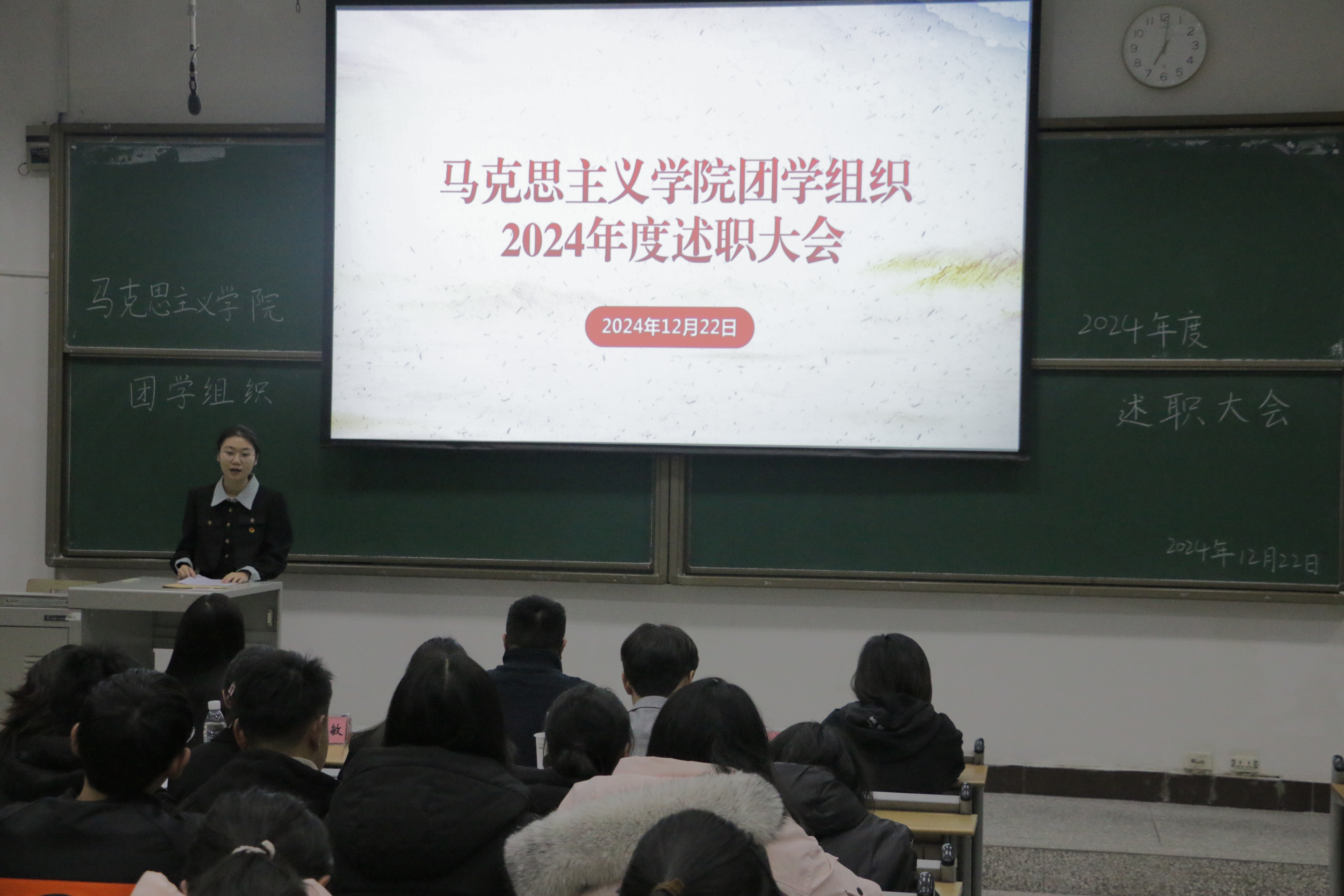 2024年12月22日晚,我院团学组织2024-2025学年第一学期学生干部述职大会在知津楼红河七阶顺利举行。mansion88主页团委书记李华夏,mansion88主页教师伍沈平,mansion88主页教师黄慧敏及全体学生干部、干事共70余人参加。