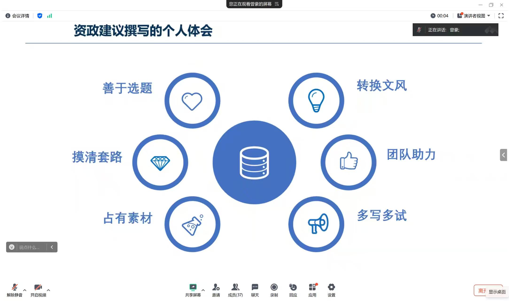 在第二个环节,曾豪围绕资政建议写作技巧主题,从善于选题、摸清套路、占有素材、转换文风、多写多试、团队助力等方面,进行具有针对性的讲解与指导。