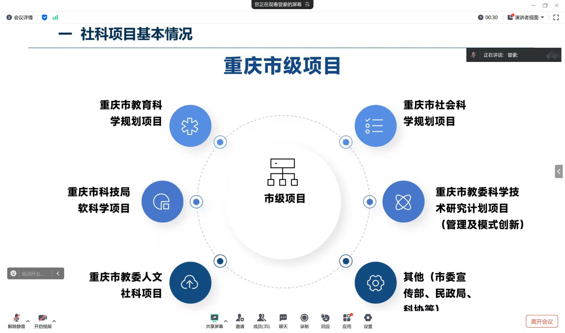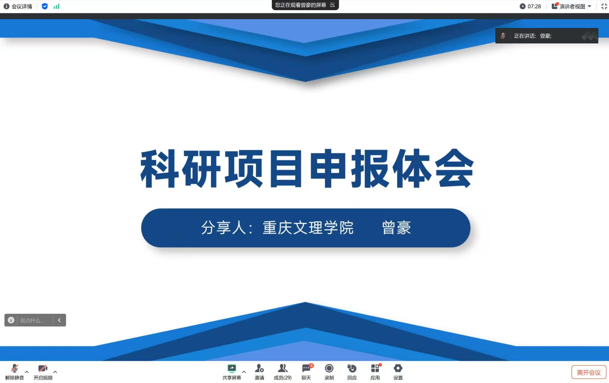 为扎实推进国家社科基金申报工作,提升教师科研能力,不断强化有组织科研,mansion88主页于1月18日上午通过腾讯会议开展2025年国家社科基金项目申报专题培训会。本次会议邀请国家社会科学基金高校思想政治理论课研究专项立项者曾豪副教授进行指导。会议由mansion88主页党委副书记、院长张莉主持,学院全体教职工参加。