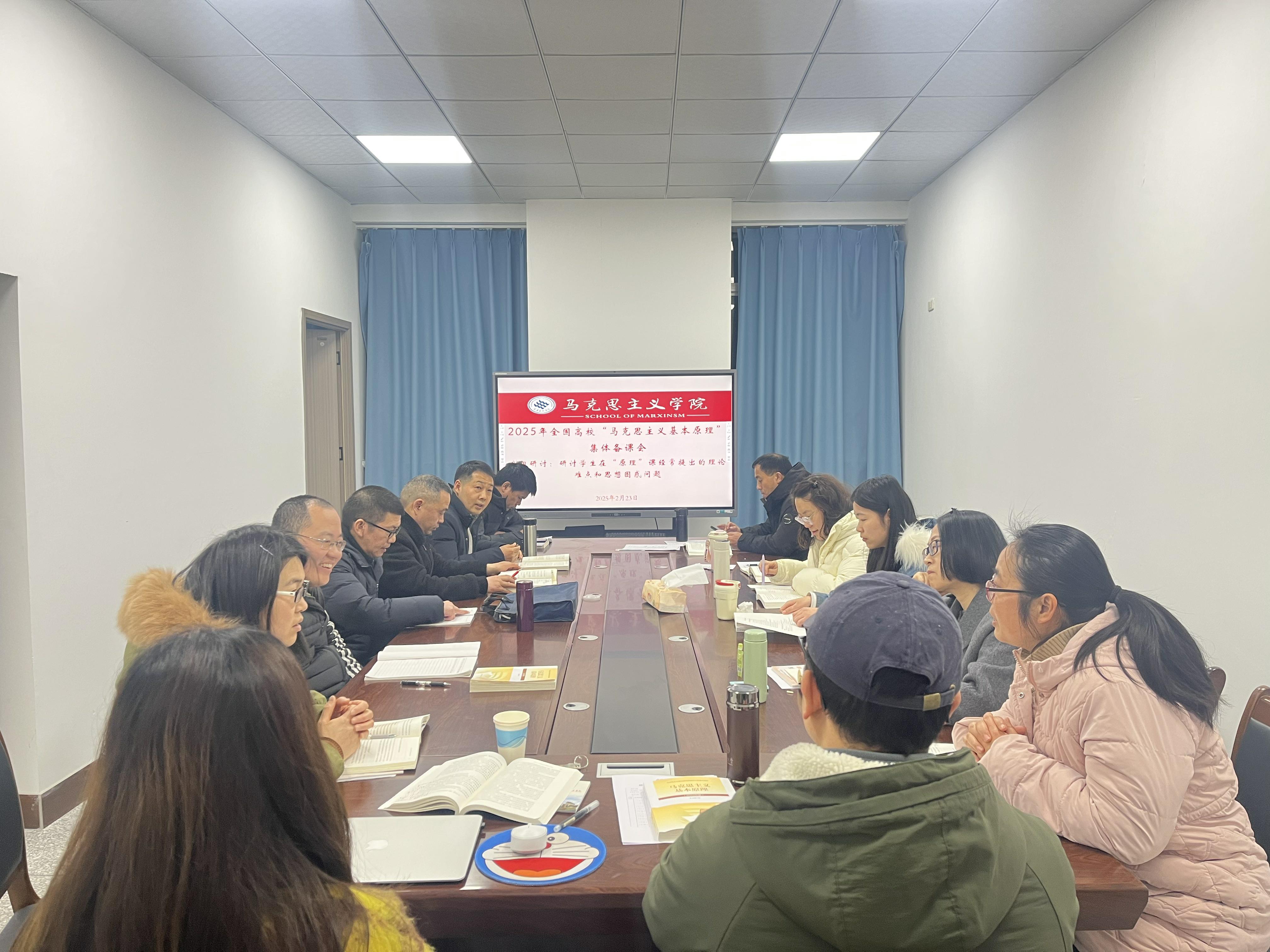 为深入学习贯彻习近平总书记对学校思政课建设作出的重要指示精神,2025年2月23日晚上、2月25日下午,学院《马克思主义基本原理》课程教研室开展了“以学理讲政治”为主题的两次集体备课会。