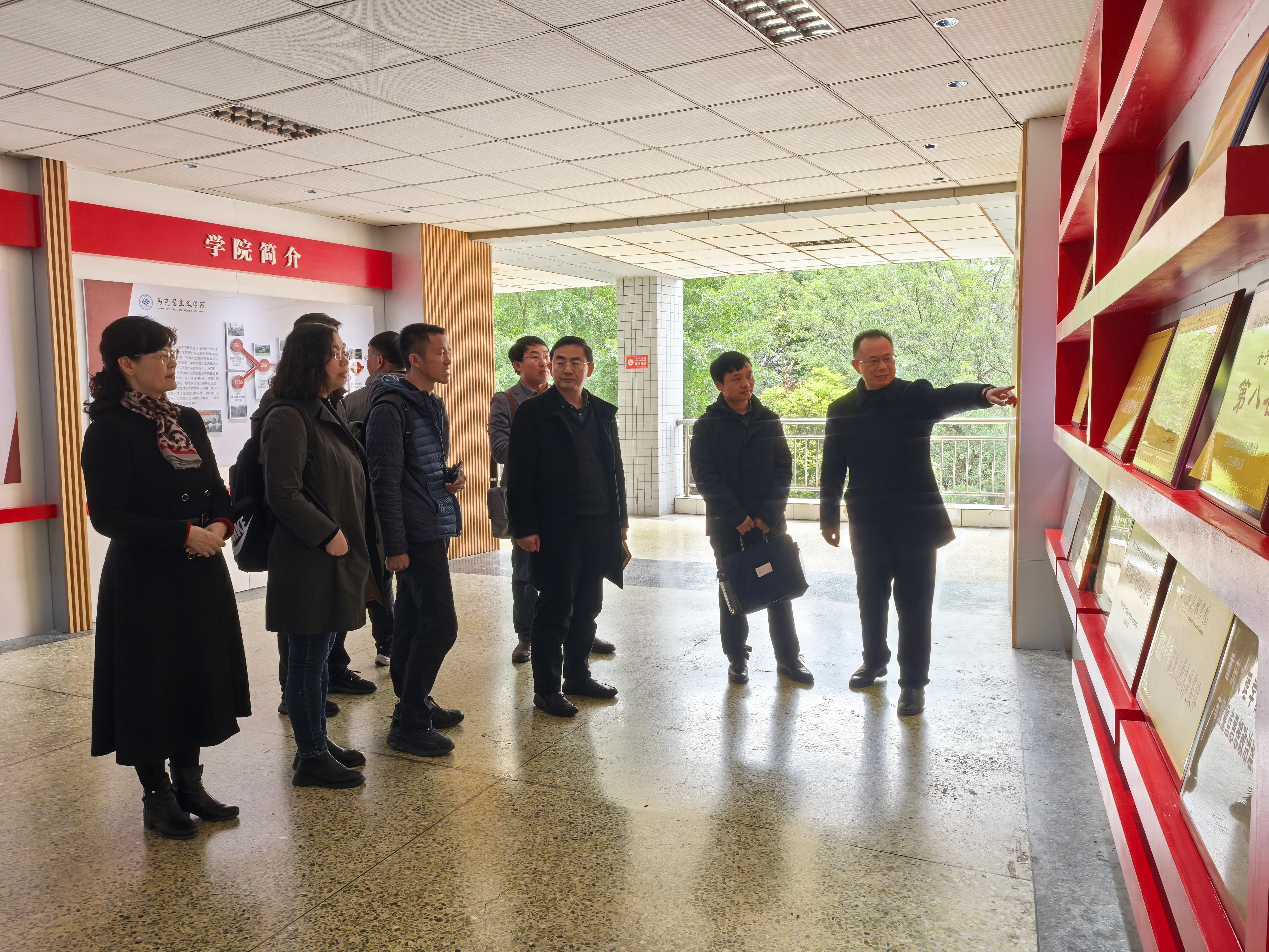 在实地考察环节,考察团首先参观了我院特色文化墙建设,深入了解学院发展历程、取得突出成绩与文化建设成果。