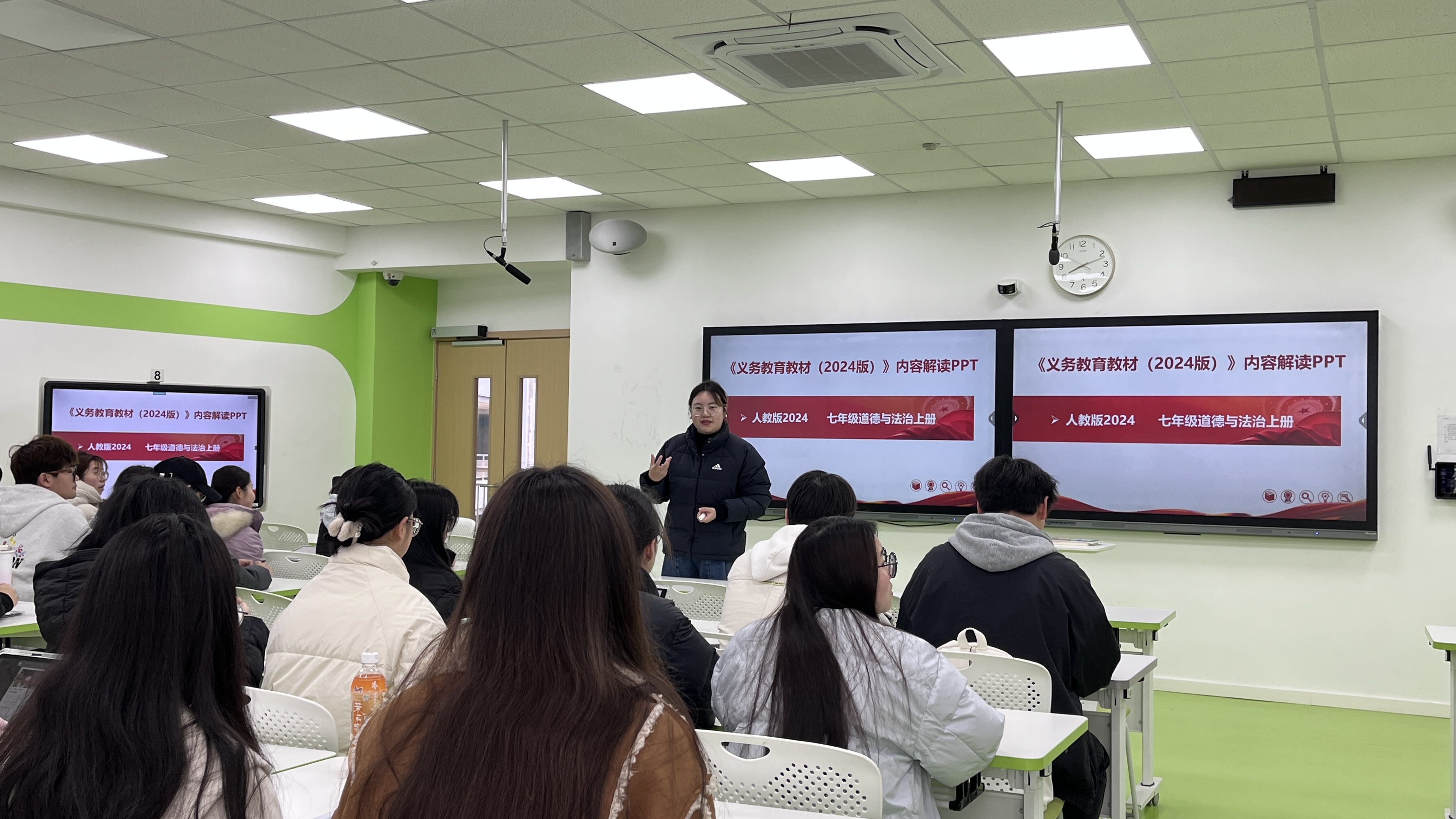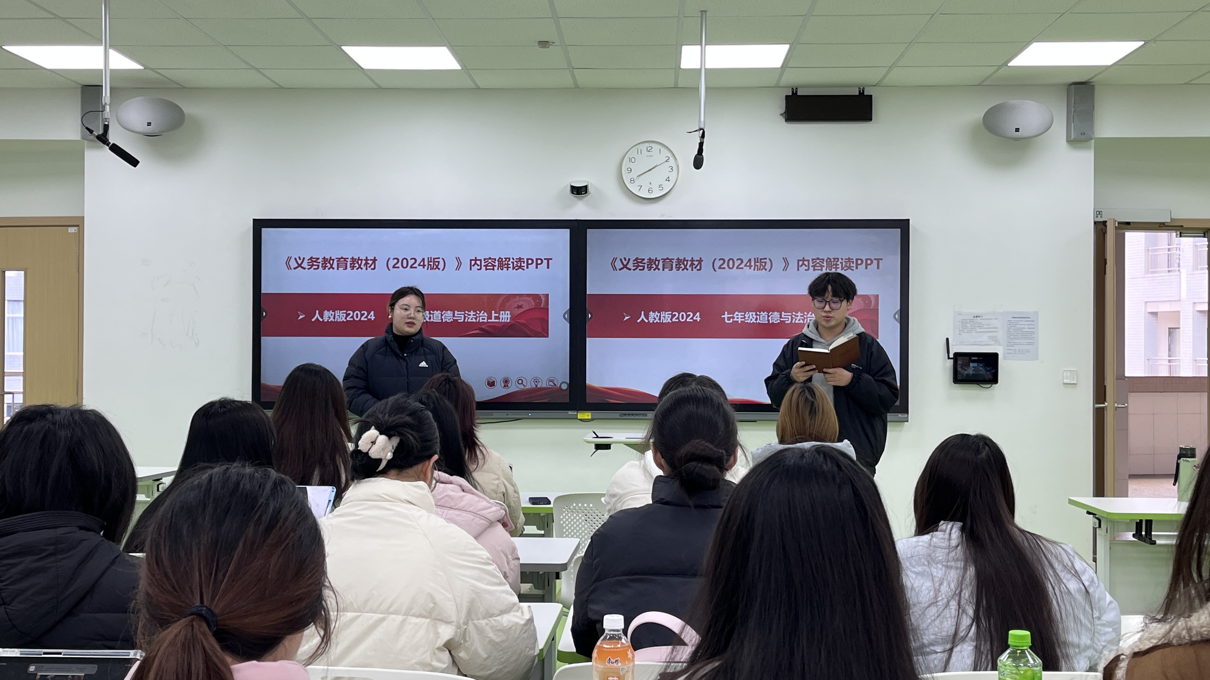 蔡爽老师以“新课标背景下道德与法治课程的教学探索”为主题,结合七年级《道德与法治》教材的整体变化,深度剖析了教材修订的逻辑与教学实施要点。她强调,教师需立足学科核心素养,灵活运用情境创设、案例讨论等方式,将抽象的理论转化为贴近学生生活的实践课题。同时,蔡爽老师结合自身赛课经验,从教师备课、学生参与双重视角提出建议:“一堂好课需要以学为中心。学生需要不断地尝试与反思,教师既要注重教学设计的逻辑性,更要关注课堂的灵动性,让师生在思维碰撞中共创知识。”通过蔡老师的深入讲解和典型示范,现场学生切身感受到初中道德与法治课趣味性与思辨性融合的教学设计魅力。