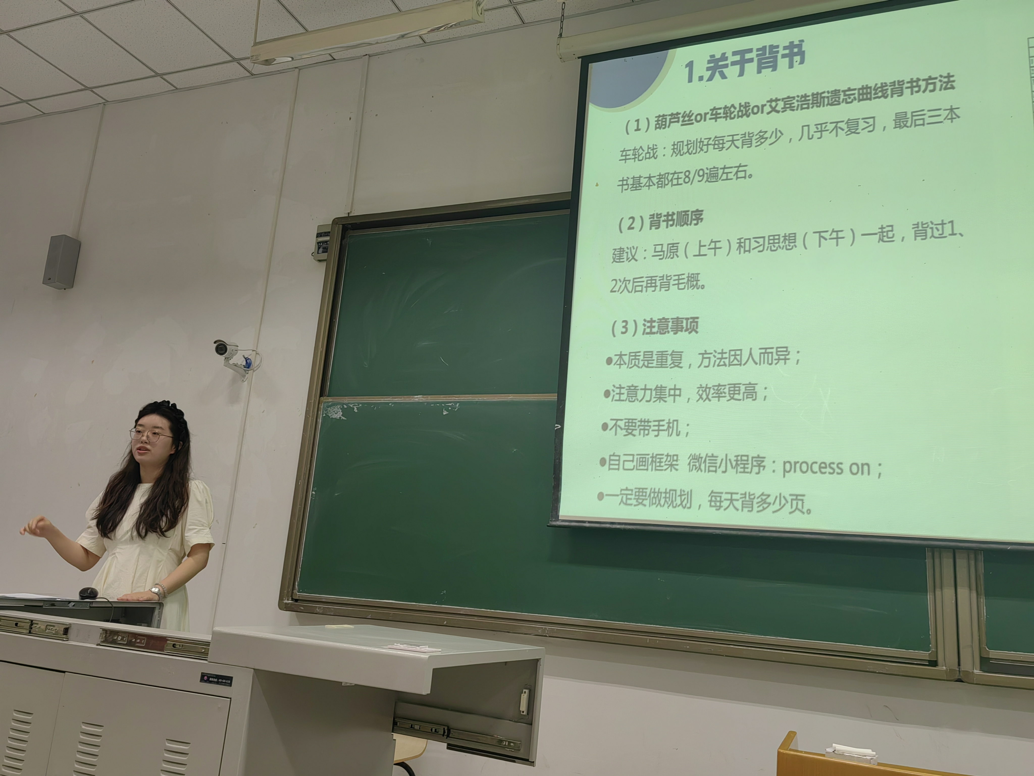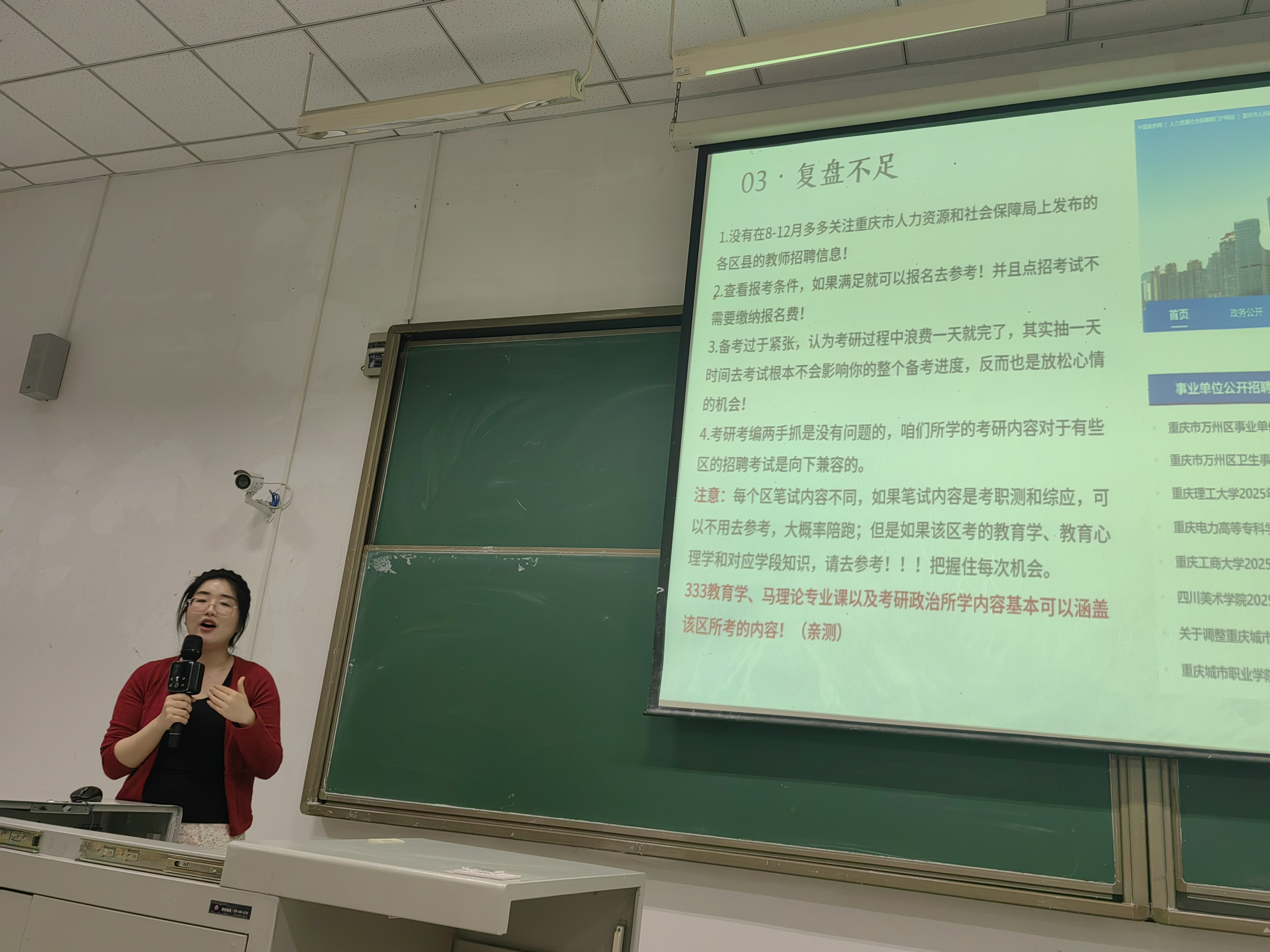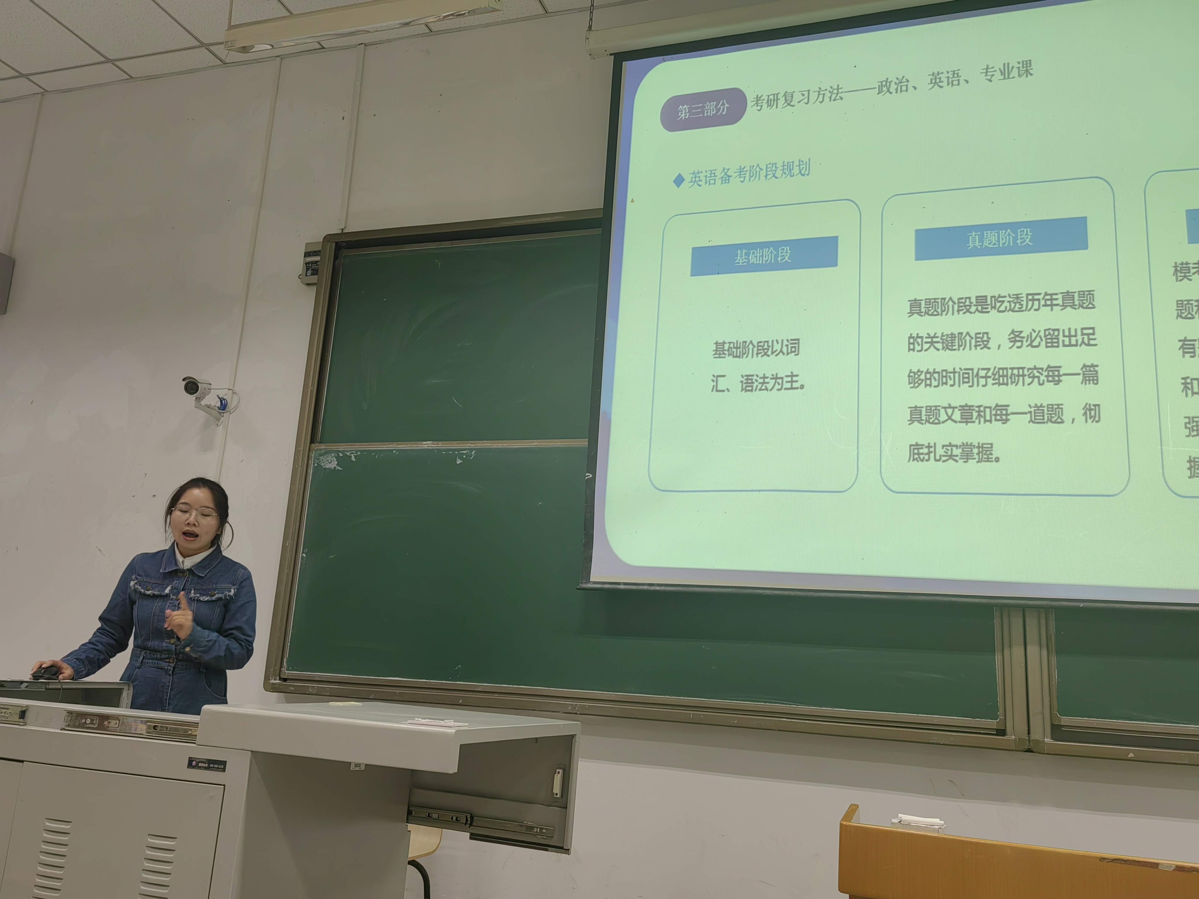 在考研分享环节,李思雨、沈玉玲和顾佳三位同学依次结合自身经历,分别从考前心理准备、时间规划、复习计划制定、记忆方法、备考资料的高效利用、答题方法等方面带来宝贵的经验分享,真诚地为同学们提出合理建议。李思雨告诉了我们“梦想不会发光,发光的是追梦的你”,实现梦想最好的途径就是要做好前期充分的准备。沈玉玲告诉了我们“胜利的秘诀就是相信自己”!相信自己不是盲目自信,而是无数个日夜的辛勤付出而积攒的从容不迫和胸有成竹,是实力与底气的展现。顾佳分享了“以考研为主线、考编为副线的降维打击攻略”,将考研的专业积累转化为考编优势,实现“双线作战”的良性循环。她们毫无保留的分享,让在场同学对考研之路有了更清晰的认知与更坚定的信心。